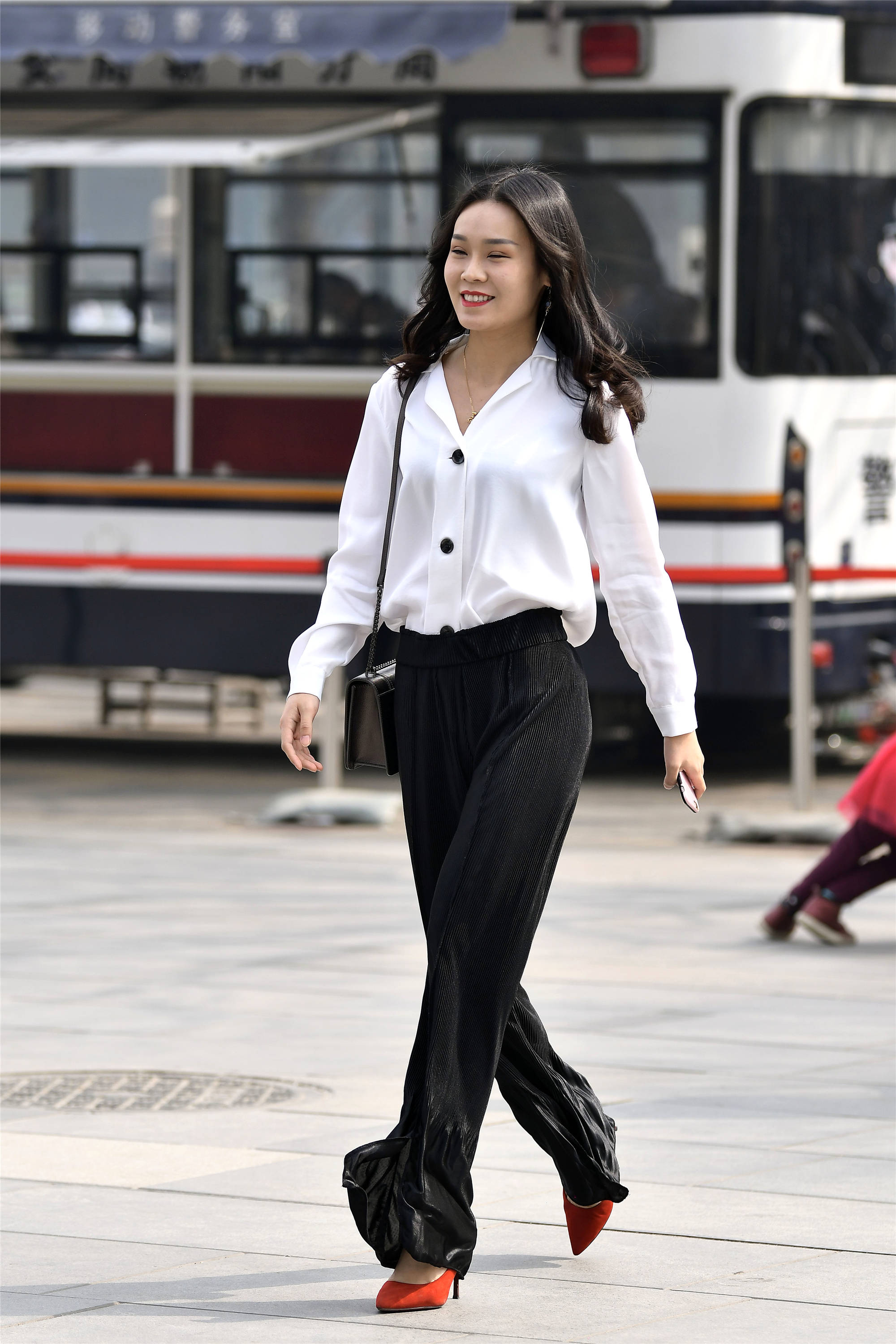 又到了一年的初春季节,气温在慢慢升高,今年春天怎么搭配?到了季节,时尚姑娘自然就会搭配的漂漂亮亮的出来逛街,选一双时尚的尖头细跟鞋,可以让你的搭配变得很精彩,而且也不会过时,这位小姐姐,黑白色对比搭配,白色衬衣搭配黑色条绒高腰裤,裤脚散开,让走路更有个性,搭配一双红色尖头细跟鞋,避免裤脚接触地面。