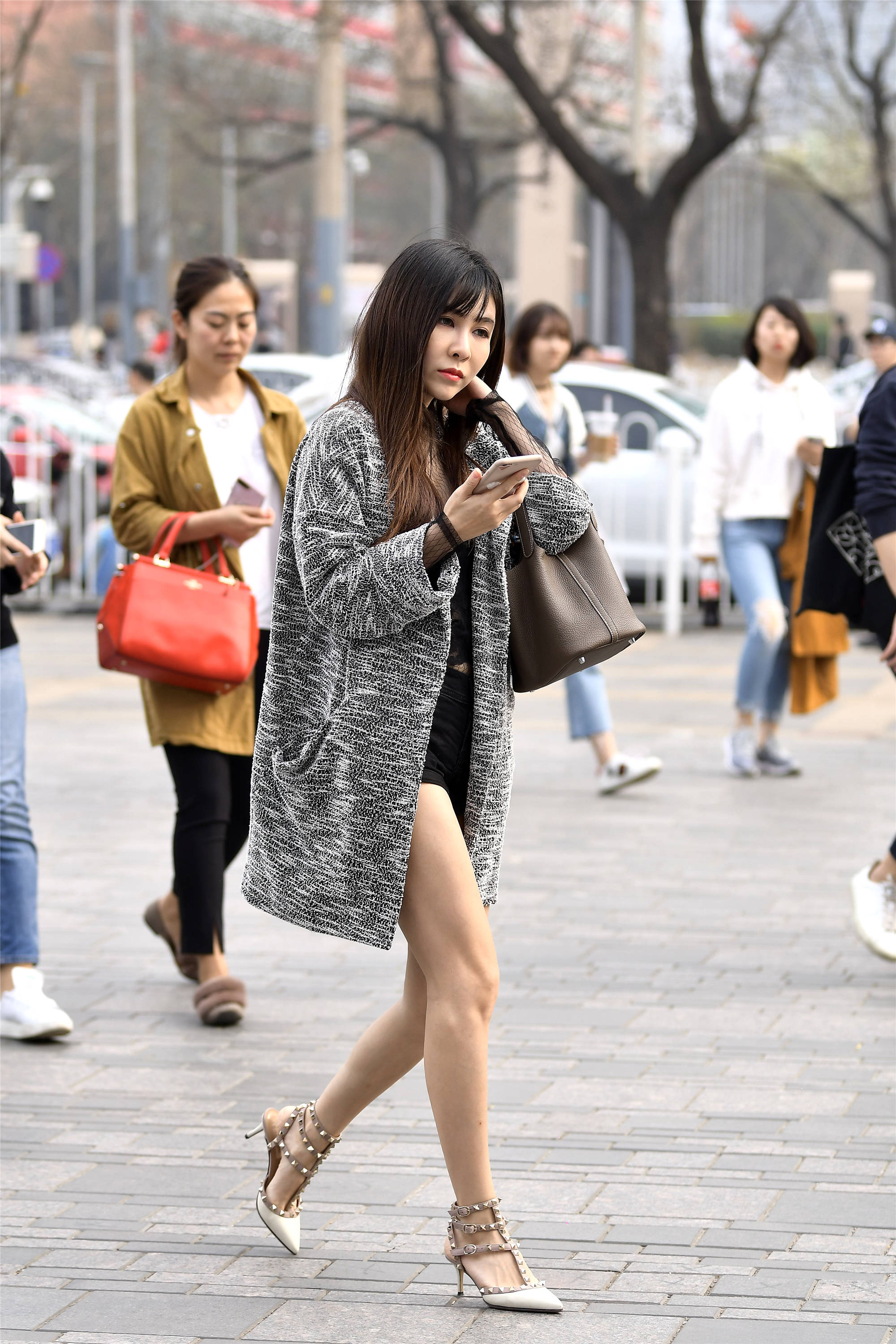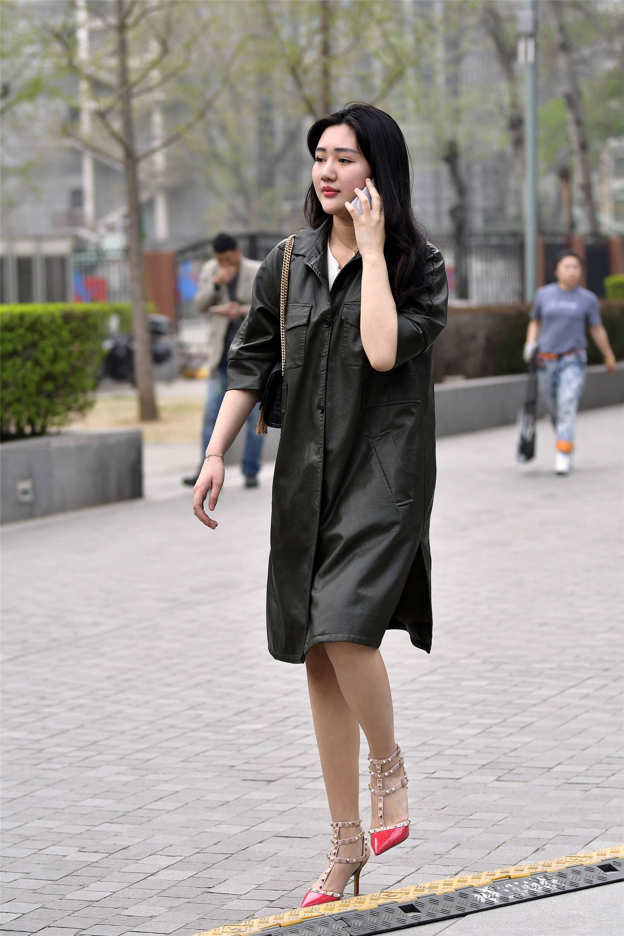 小姐姐这一身搭配更精彩,很多姑娘都希望自己能够展示自己的身材,一件中长款的大衣,浅灰色设计,显得非常的贵气,而且她的身材也非常漂亮,一双尖头细跟铆钉鞋,三层的铆钉设计,非常漂亮,也是这款鞋子中的经典设计,鞋跟不高,可以很舒适的逛街。