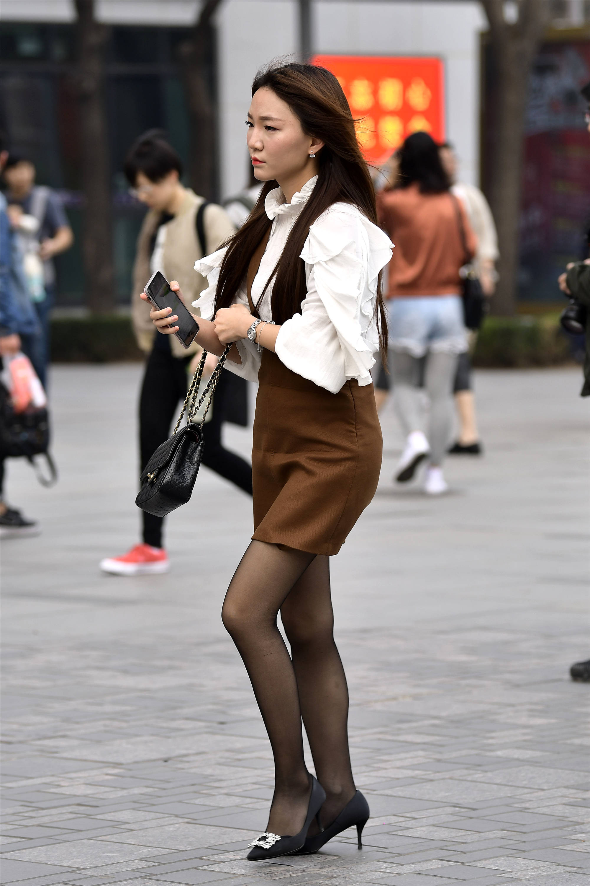 有时候搭配需要很好的层次感,所以怎么选择衣服也是很重要的,白色的纱料小衫,层次感非常好,而且设计的也很漂亮,深棕色的高腰筒裙,非常个性,而且也很显身材,有着职场白领的搭配味道,一双黑色厚丝袜,穿着一双黑色尖头细跟鞋,鞋尖的水钻装饰也非常漂亮。