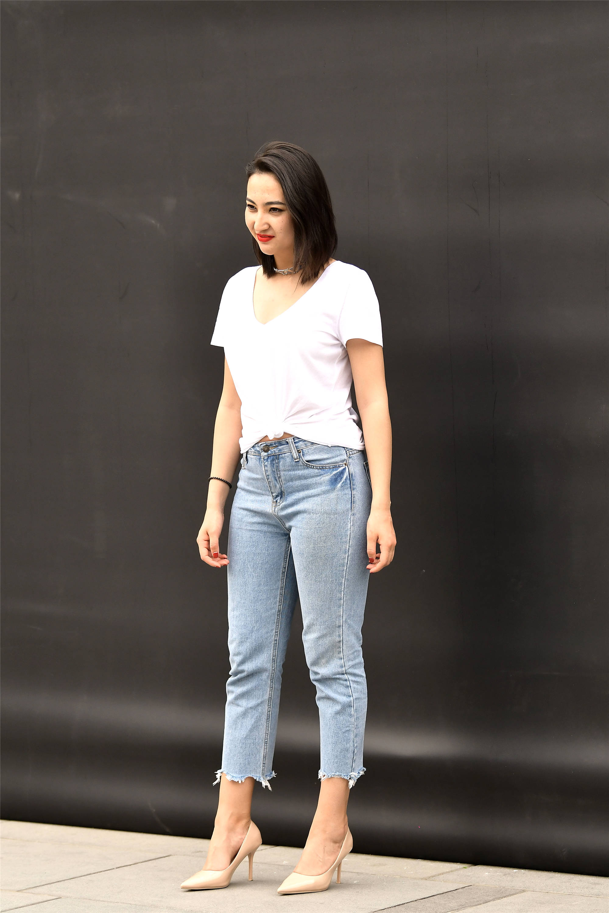 身材高挑的姑娘,可以搭配出很不错的效果,而且小姐姐搭配也很简单,一件白色半袖,前衣襟被挽起,是为了秀出她高腰的牛仔裤,姑娘把自己的裤脚剪了,变成了七分裤,搭配一双裸色的尖头细跟鞋,很好的衬托她的身材,而且小姐姐五官非常立体,这一身简单的搭配很漂亮。