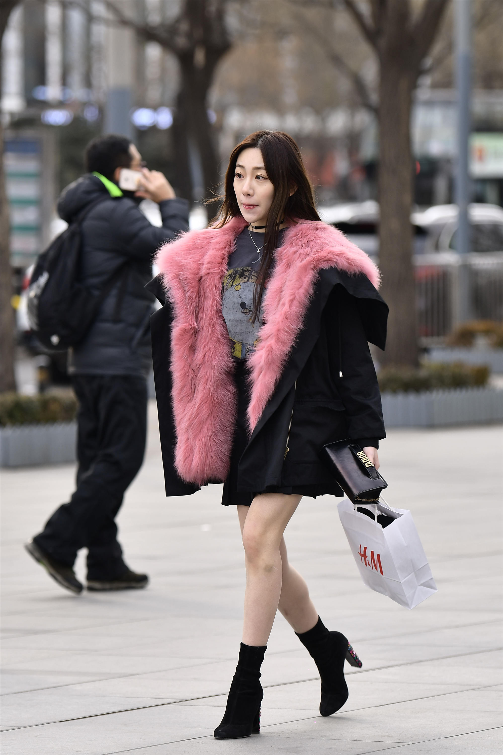 这位小姐姐是真的不怕冷,一件皮草,外面是黑色布面,里面是粉红色的皮毛,如果小姐姐不敞怀,你绝对不会想到这是一件非常内秀的皮草,也会显得非常低调的感觉,看着保暖效果很不错吧,小姐姐光腿搭配一双短款高跟袜靴,粗跟的设计让走路更方便,而且袜靴也更好的延长效果长度,也让展示处最细的脚踝部分,而且穿着这双高跟短靴走路也非常自然。