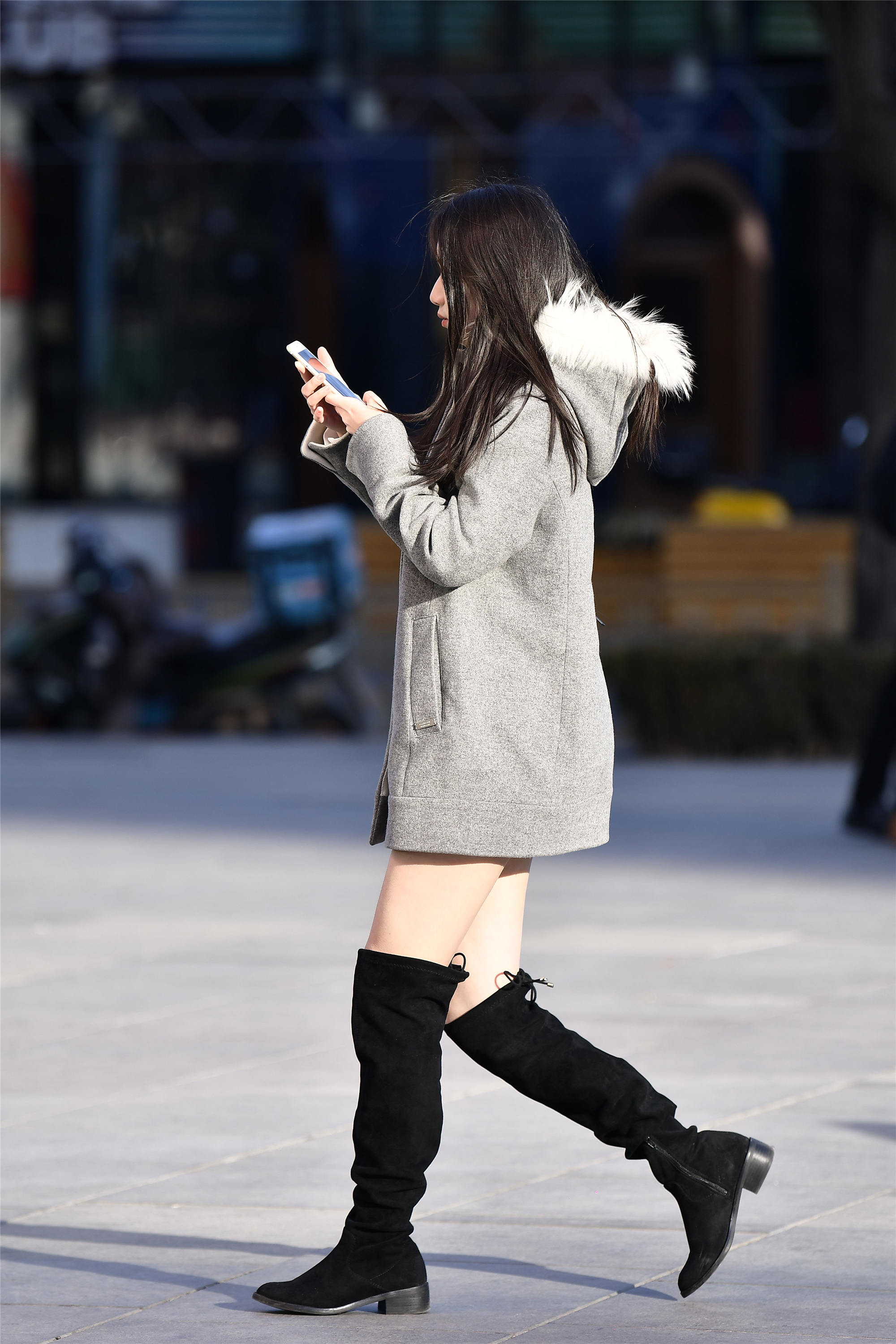 春天的到来,逛街的小姐姐也多了起来,爱美的姑娘,逛街就要搭配一下,所以她们逛街都会仔细的想着怎么去搭配自己的衣服,这位姑娘的搭配很简单,一件灰色的中长款棉服,因背后的帽子设计,装饰作用很不错,搭配一双黑色绒面长靴,本来是过膝靴的设计,姑娘选择的靴筒有点宽,堆叠一下,这样会更显瘦,阳光下走过,也不觉得冷了。
