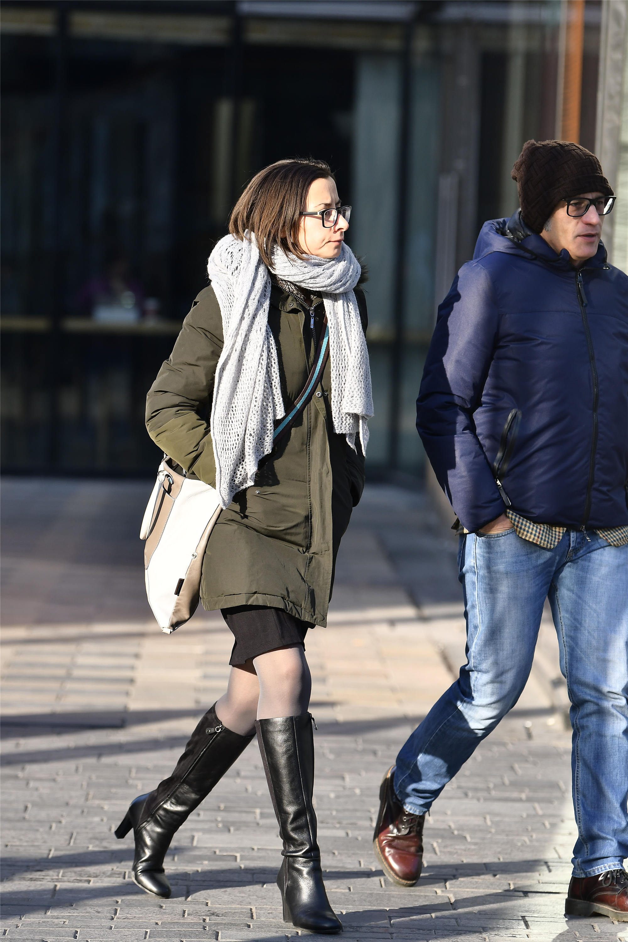 春天的姑娘,好像她们很自然的就要秀一下自己,她们对于时节和气温的把握特别的好,看一下这位外国姐姐,她的春装搭配也很不错,一件灰绿色的羽绒服搭配一条浅灰色针织围巾,单肩包也非常个性,一条黑色短裙,只露出一点点,灰色丝袜和一双高筒皮靴,5公分作用的方跟,让她走路轻松,也带着优雅的步调,这样是一种简约的风格,却搭配出不错的时尚感觉。