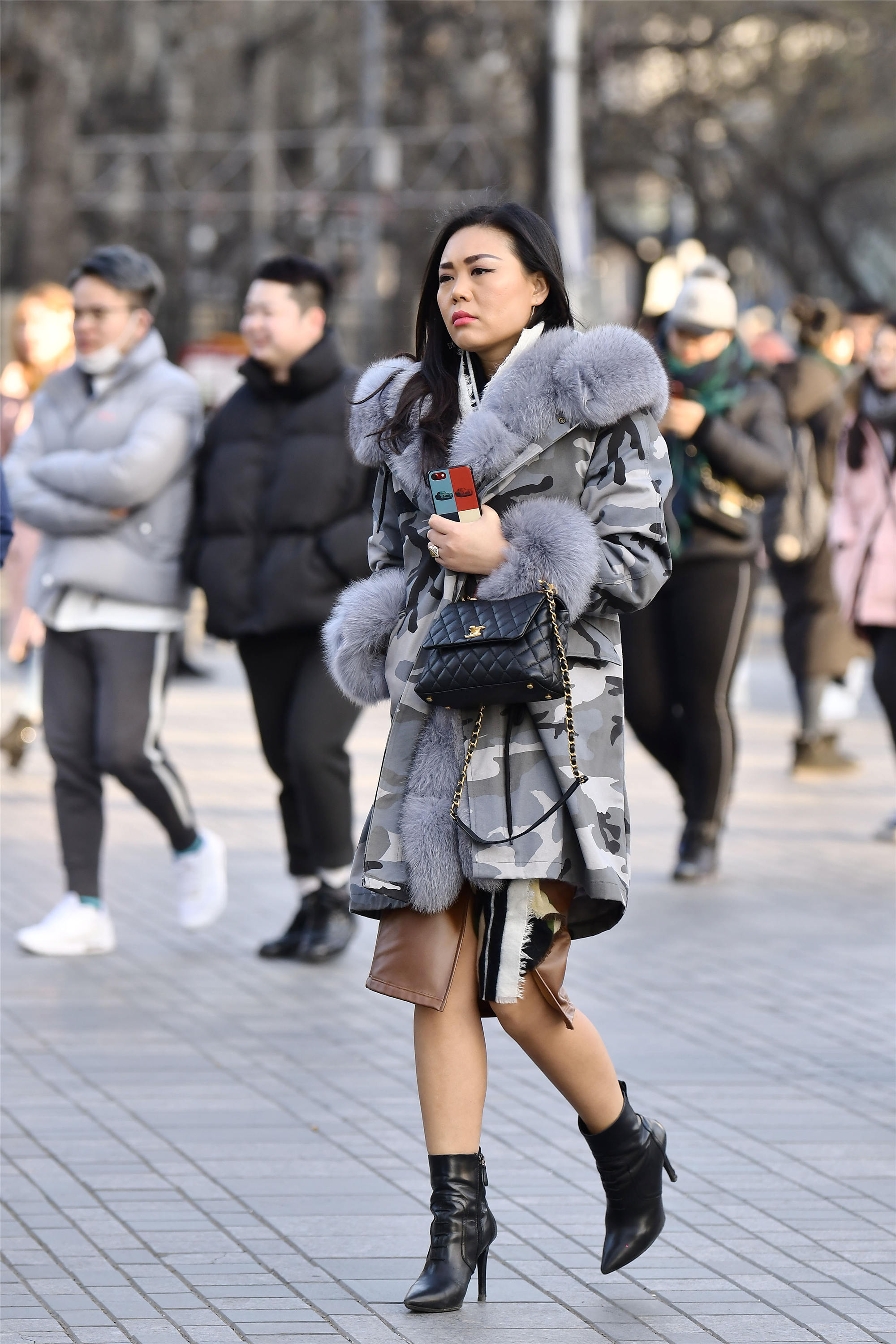 春天的搭配可以非常有层次感,不一定色彩非常多,依旧可以搭配出很美的效果,看一下这位小姐姐的搭配,黑灰色的迷彩大衣,却在领口与袖口处设计的是灰色皮草装饰,这样显得特别的漂亮,棕色皮裙边缘在大衣的下摆,露出来一些,小腿露在外面,搭配一双尖头细跟的短靴,黑色皮面,有展现了脚踝的纤细。