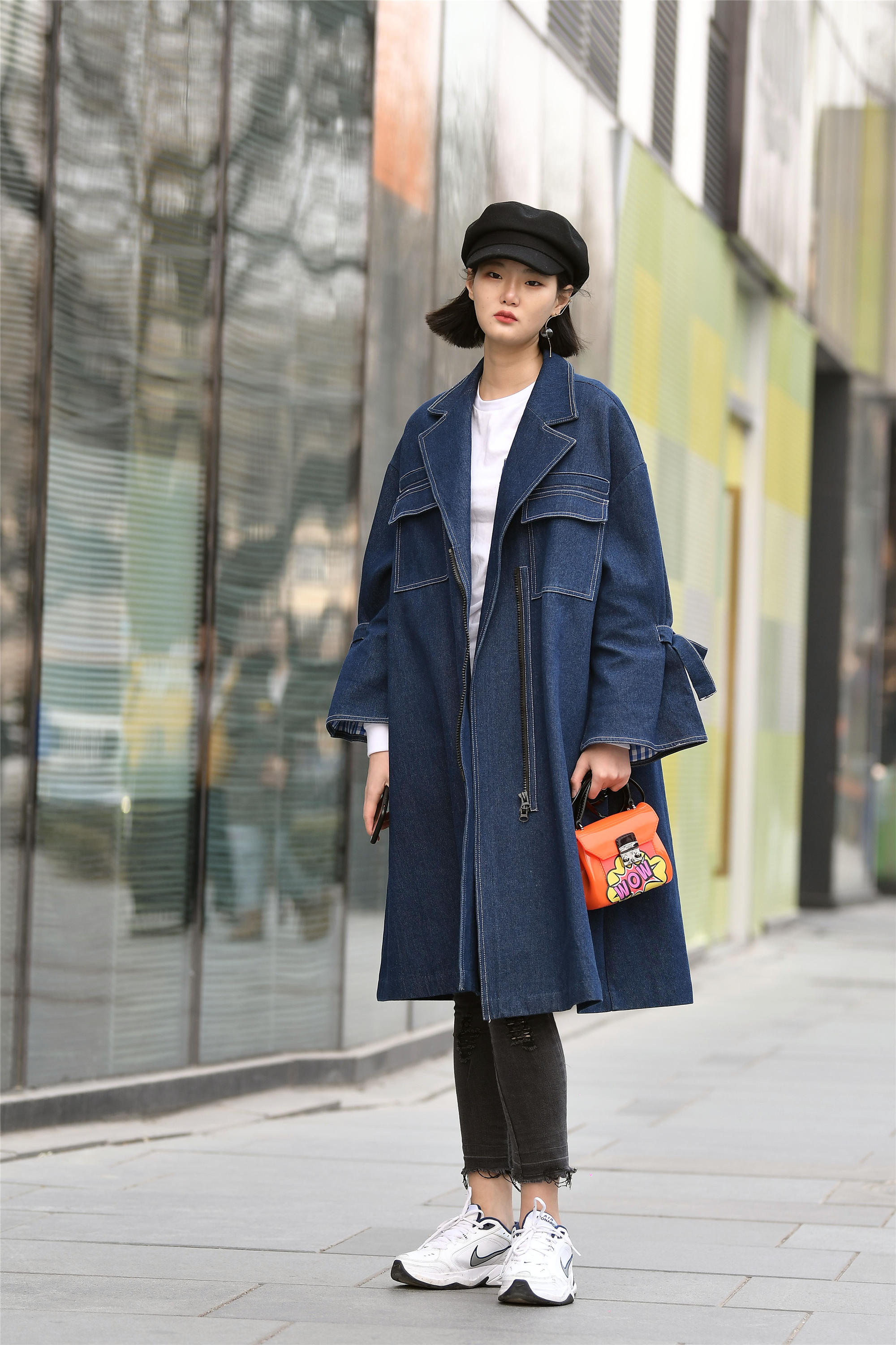 春风起,吹走了冬日的寒冷,也吹的行人多了起来,很多年轻姑娘穿着时尚的搭配,走在时尚街头,这位姑娘身材高挑,选择一款深蓝色牛仔风衣,看着就有着年轻的搭配范,黑色牛仔紧身裤,毛边的裤腿到脚踝的位置,搭配一双白色运动鞋,非常简约的风格手里的橙色拎包,增加暖色调,黑色帽子和飘起的短发,你就知道选择这款帽子是很实用的。