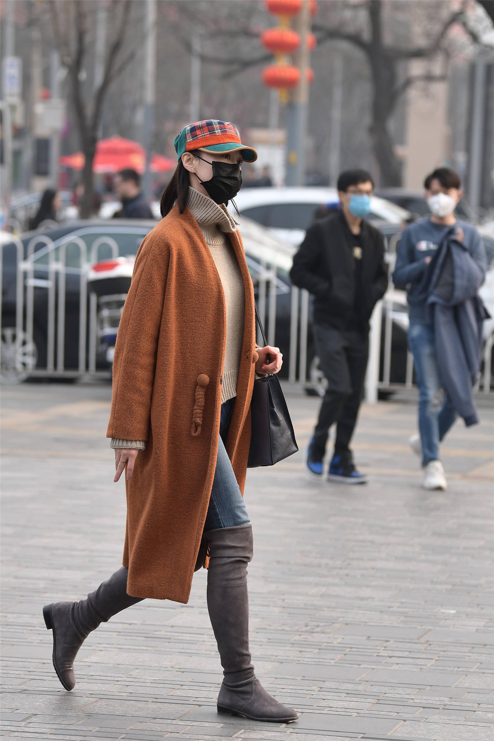 在春天穿着风衣要搭配出风度来,扣子最好是不要系,因为可以展示出自己的内搭,也可以在走路的时候,有着飘起的效果,这样会更有洒脱的味道,也带来风度的效果,这位姑娘的棕色大衣,休闲风很足,搭配高领针织毛衣,蓝色修身牛仔裤搭配灰色麂皮过膝靴,是春天里经典的搭配,而且很显身材,一顶彩色格子帽,真不是谁都敢尝试这款帽子的,红与绿的搭配色彩,就让很多人不会选择。