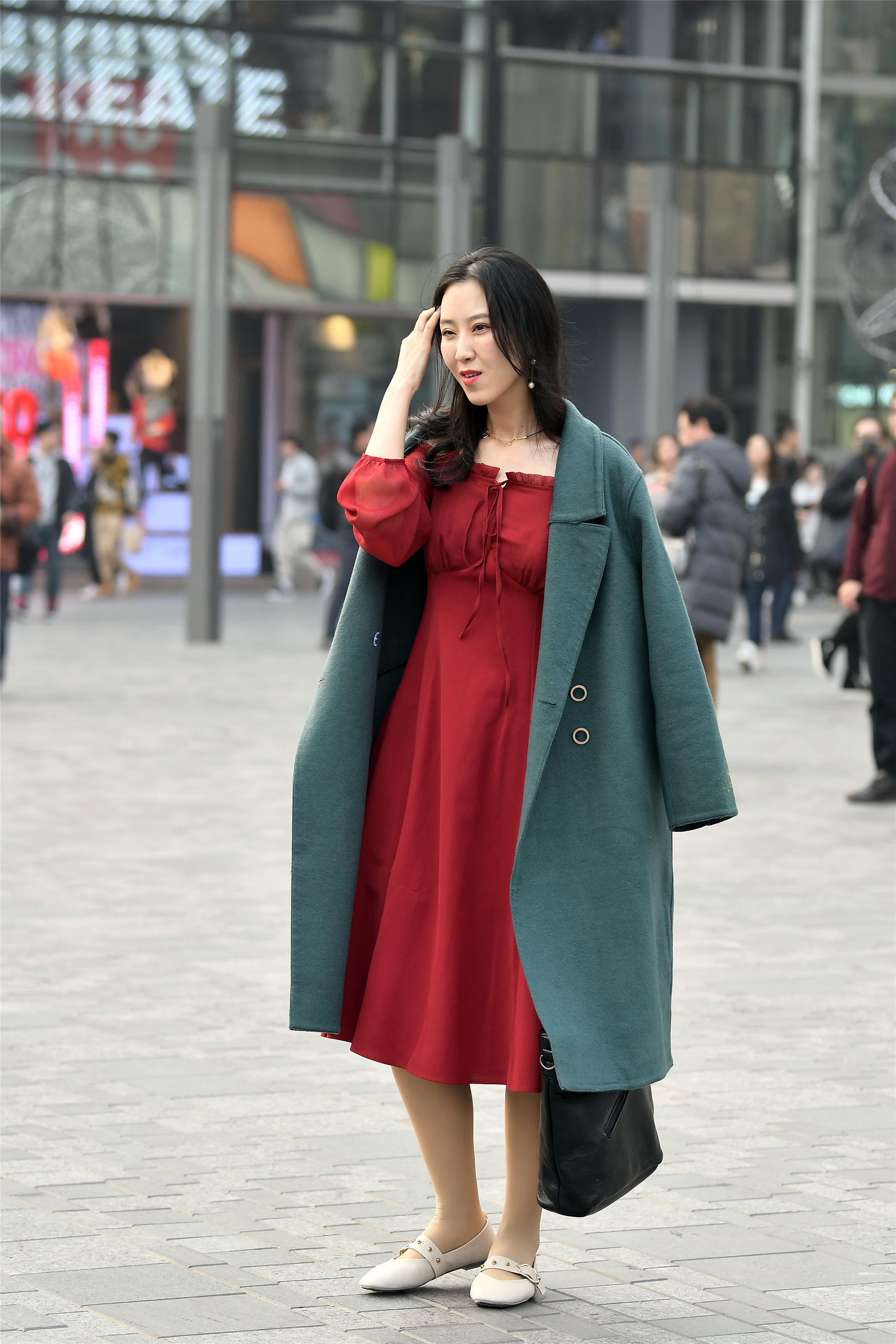 都说红与绿最好不要搭配在一起,却有人不相信,敢于去尝试,看一下这位小姐姐的搭配,红色连衣裙搭配墨绿色的风衣,让你感觉这样色彩搭配在一起也挺好看的,春天穿着一些绿色,会增加色彩感,休闲款的墨绿色大衣披在肩上,觉得非常有个性的穿搭,红色连衣长裙,宽松的款式,却有着很高的腰线,这样会显得姑娘身材很好,一双平底的米白色皮鞋,虽然不会尘托身材高挑,但是逛街穿着很舒适。