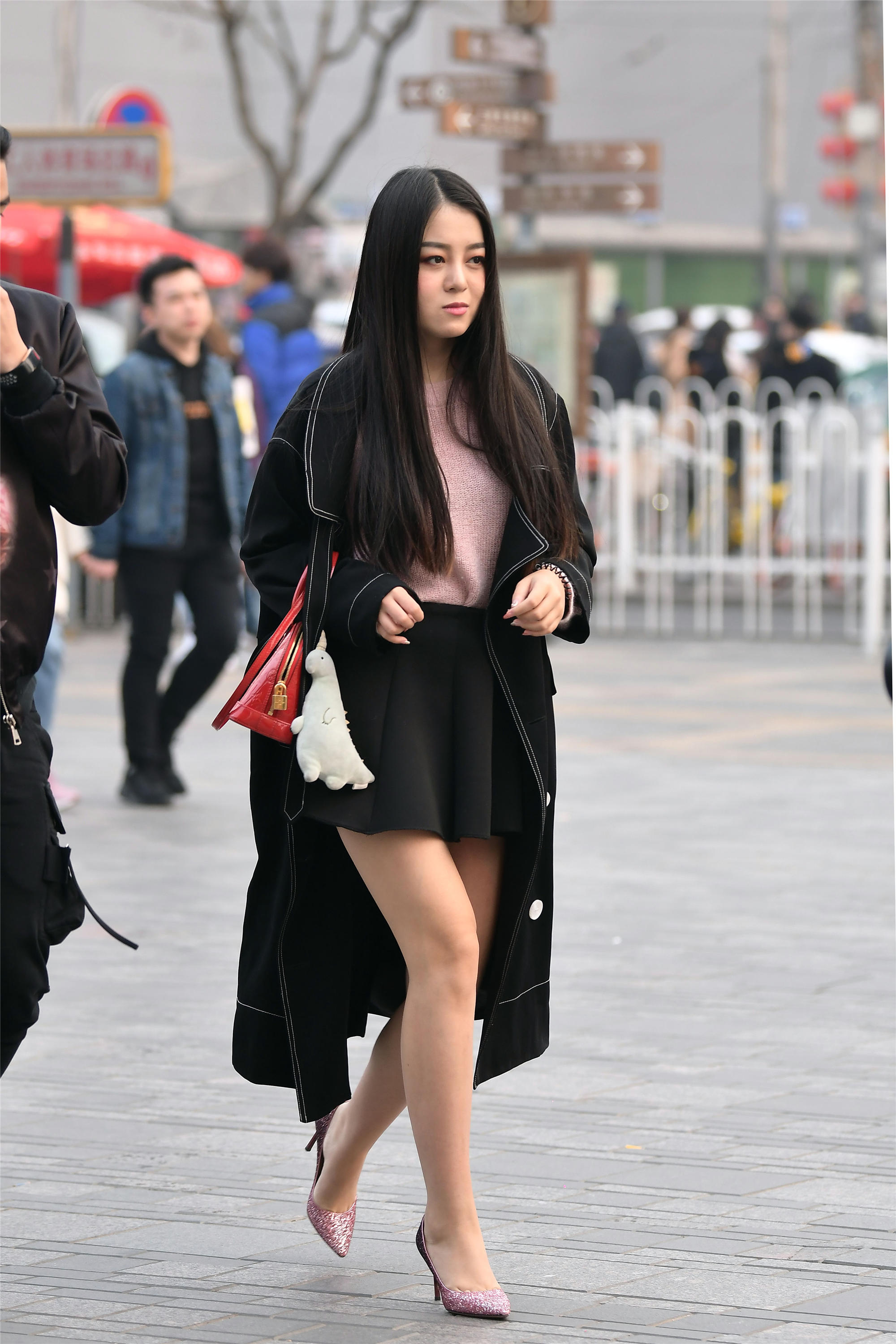 春天的姑娘,也都很会搭配自己,她们选择逛街会在下午,也是温度比较高的时候,可以穿的少一些,看一下这位小姐姐,这一件黑色风衣,边缘的白线增加层次感,粉色针织毛衣掖在高腰短裙里面,光着腿出行,真是一点也不怕冷,一双彩色的亮片尖头细跟鞋,渐变色色彩,还带着闪闪的效果,也让姑娘身材看起来更显高挑纤细,让小腿更显修长,长发遮住脸颊,更显脸小。