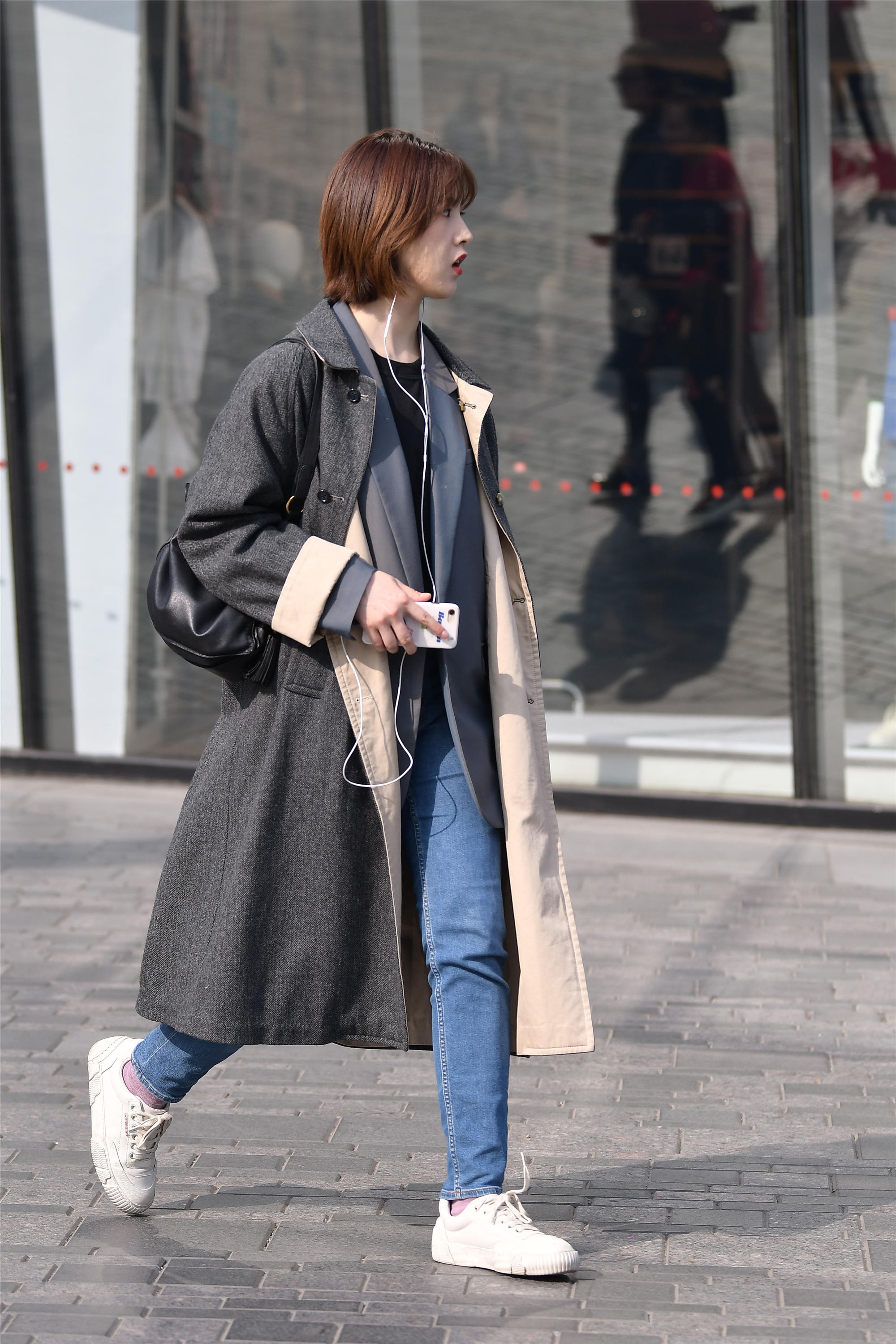 不同的姑娘,会喜欢不同的风格搭配,都是穿着风格,却有人搭配的成熟,有人搭配的休闲,很难说哪种风格最后看,主要还是看个人的喜欢,这位小姐姐的搭配,很简约的风格,深灰色的大衣,内衬是卡其色,灰色休闲西装搭配在里面,看着是不是还有些正式的感觉,但是搭配修身牛仔裤和一双白色运动鞋,一下子有了运动风格,她的短款发型显得很精致。