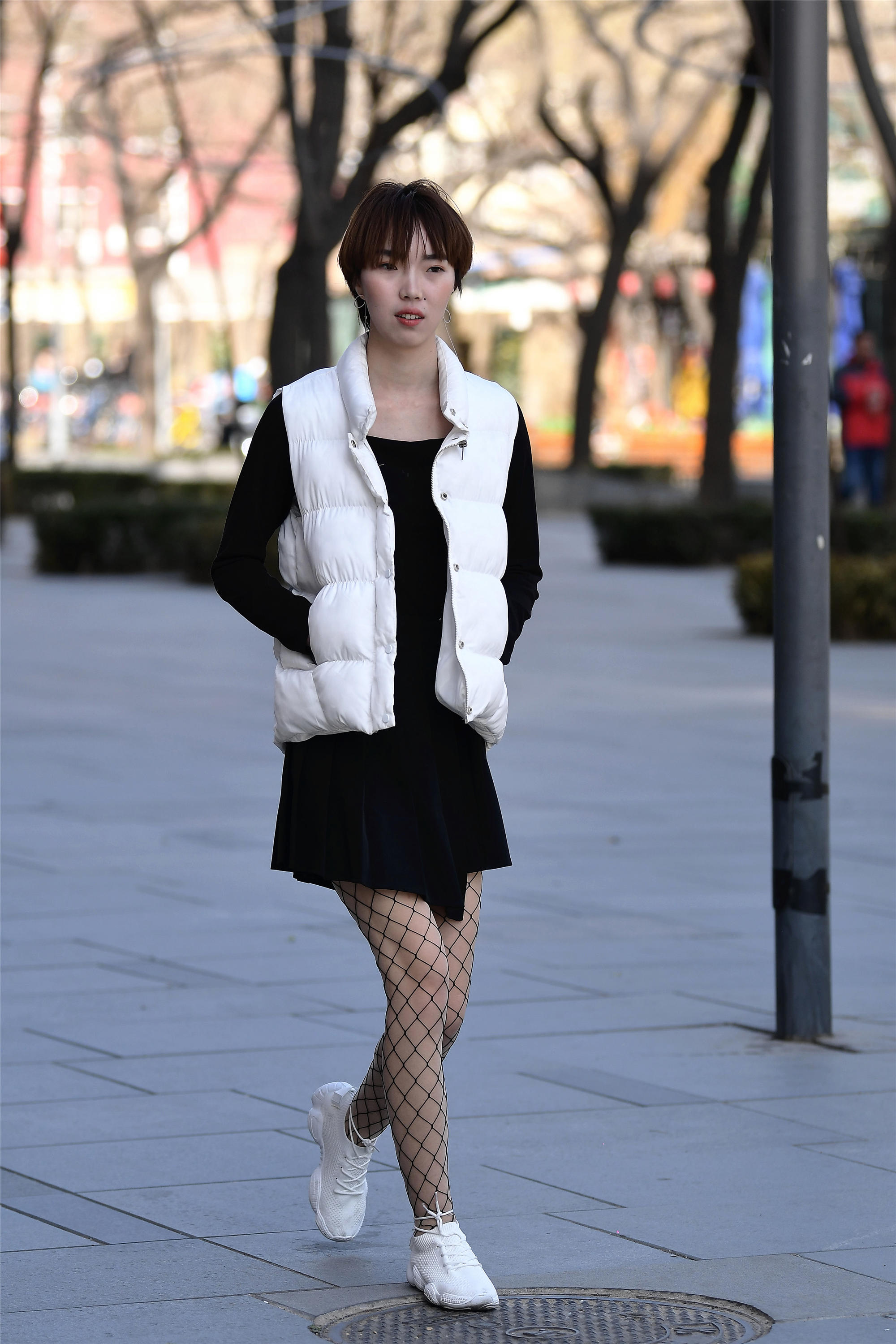 裙子的多种多样,所以适合不同身材的姑娘,无论是高矮胖瘦,都可以找到适合自己的一款裙子,春天搭配裙子,可以搭配出不一样的时尚感觉,有着季节的搭配特点,看一下这位小姐姐,身材不是很高,但是很骨感,穿着一件黑色裙子,不规则的裙摆,让她的搭配更加层次感,一件白色羽绒马甲,可以很好的护住自己的后背,不会感觉冷,渔网袜搭配一双白色运动鞋,简单的黑白色,在春天搭配出来的效果也非常好。