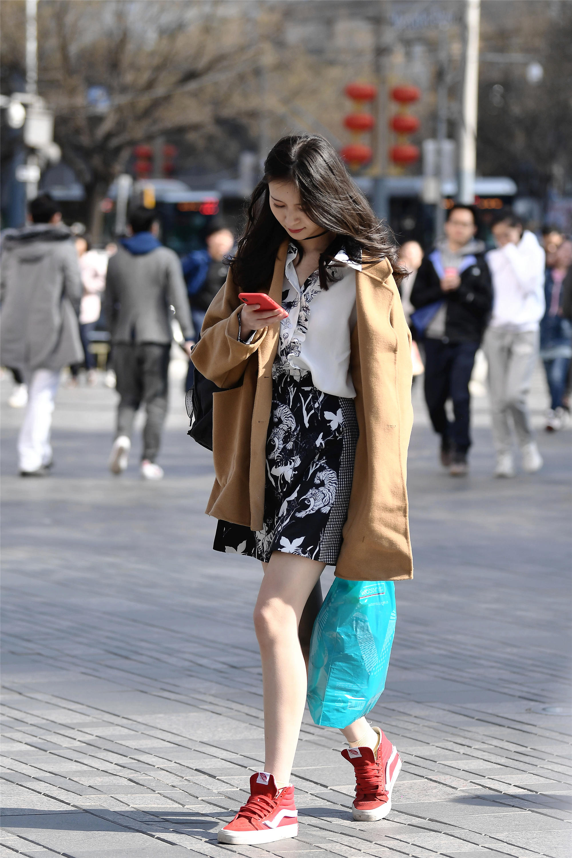 在春天选择连衣裙还是短裙出行呢?还是要看姑娘自己,想搭配哪一款出门,驼色的短款大衣,不是加厚的款式,春天穿正合适,敞开怀,这样会展示出自己的内搭,一件白色衬衣,扣子两边的黑白色印花,非常漂亮,和高腰裙融为一体,高腰的筒裙是拼接色的,前边是黑色底白色花纹,从侧面往后是黑白色小个子,裙子的层次感非常好,而且简单的色彩,非常漂亮的感觉,穿着一双高帮的平底鞋,一身春季搭配,很时尚,姑娘也很自信。