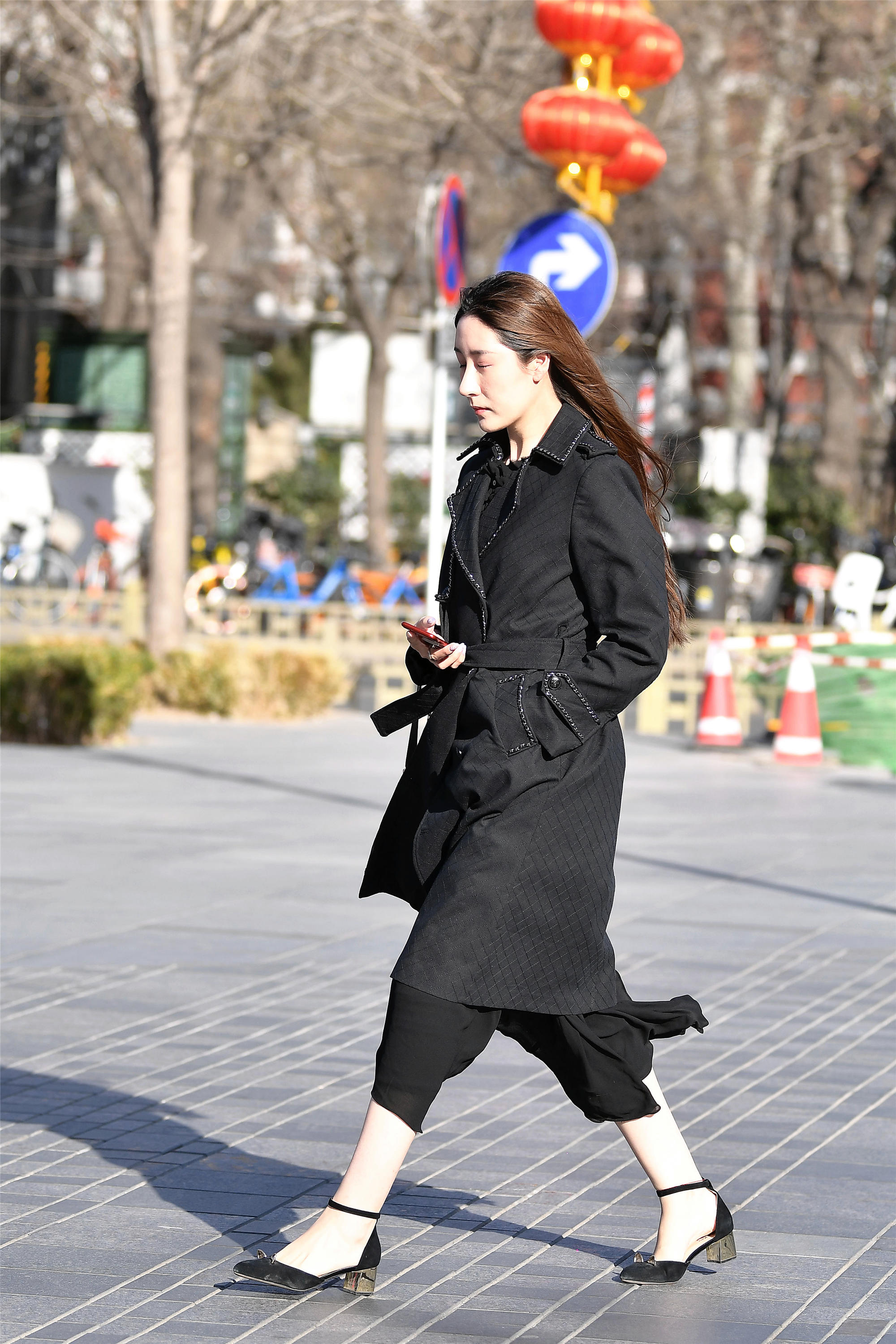 会搭配的姑娘,在每个季节都可以搭配的很漂亮,春天非常适合逛街,也很适合搭配,黑色很多人都喜欢穿搭,大众的色彩,却在时尚姑娘身上搭配的很好看,黑色风衣,姑娘把腰带系上,这样会显身材比例,但是却把她的长裙遮住,搭配一双尖头粗跟鞋,一字带绕踝,非常时尚的感觉,姑娘的头发被风在后面显得人很精致。