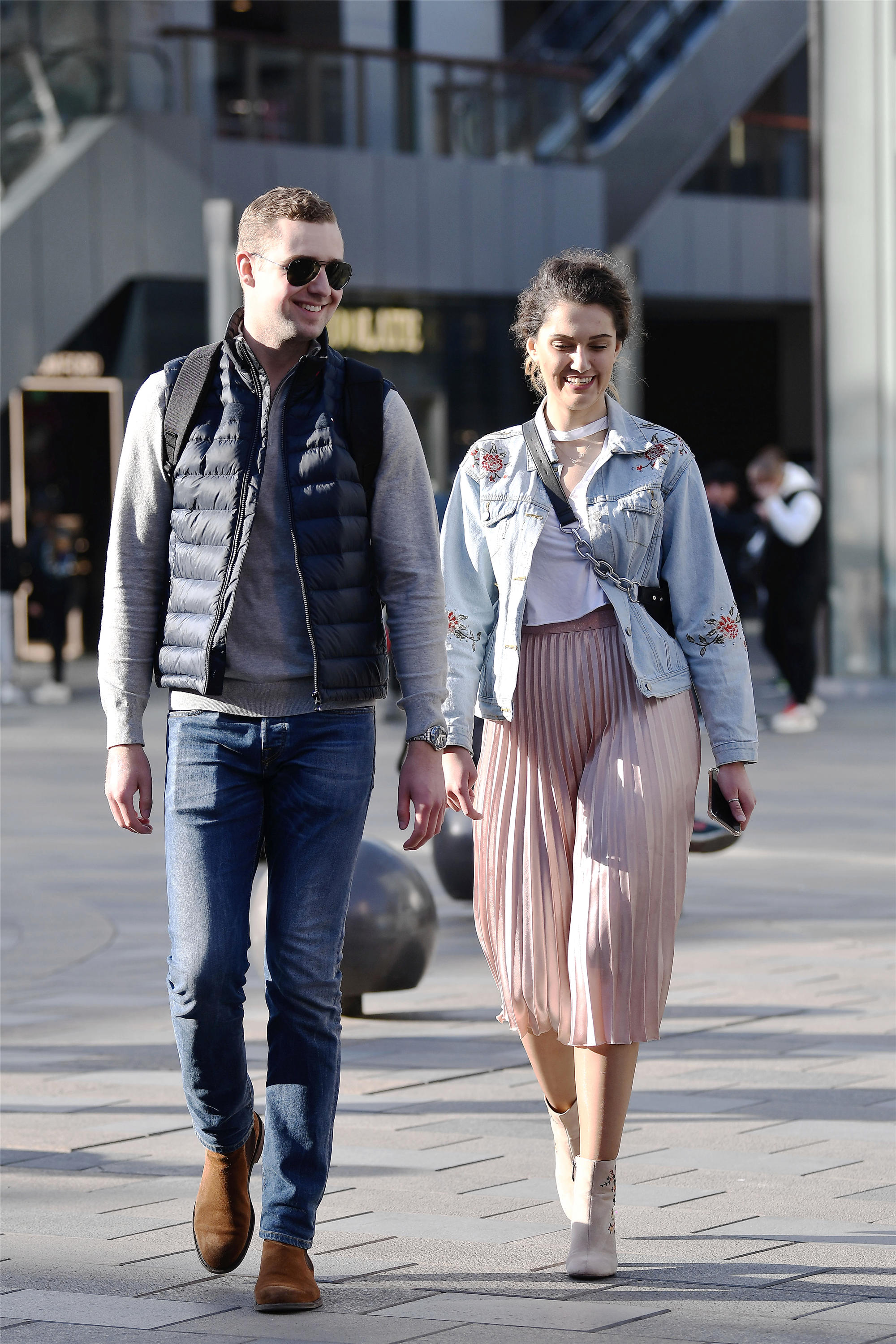 高挑的姑娘,穿着长裙更漂亮,怎么穿搭还是要看自己想搭配那种风格的,这位外国小姐姐穿着一件浅粉色的高腰压褶长裙,过膝的长度,看着非常漂亮,而且她身材是微胖的,但是身材高挑,所以看着匀称,有一种丰腴之美,白色短款小衫,搭配一件浅蓝色的牛仔外套,上面的刺绣很漂亮,色彩和层次感都很好,肉色的亮光丝袜搭配一双浅色高跟短靴,也是很不错的春季搭配,很有层次感。