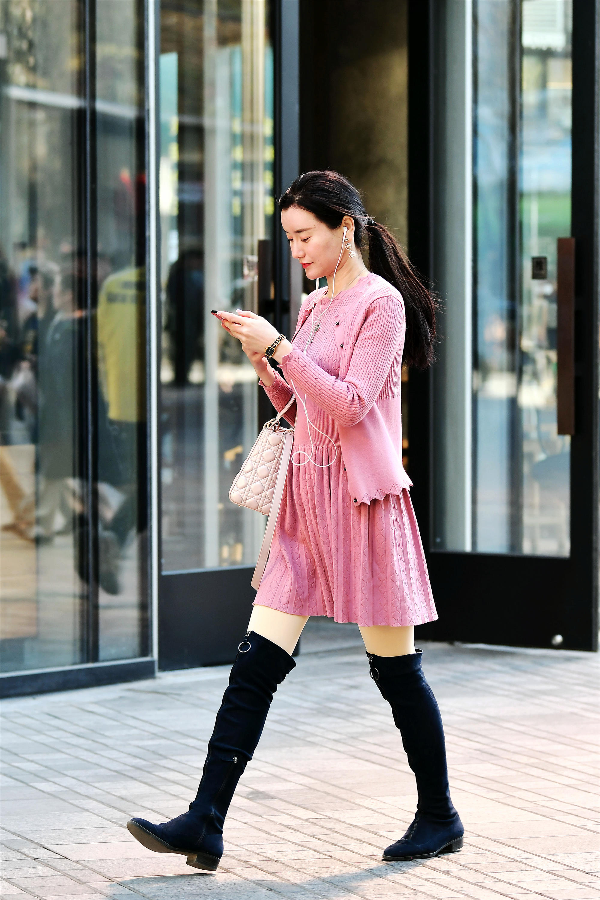 紧身连衣裙,也会被时尚姑娘搭配出来,春天穿着这款浅粉色的连衣短裙,修身效果不错,也可以看出姑娘对自己身材的自信,一件短衣襟的棉夹克,显得非常小巧,黑色蕾丝小衫,透视效果增加了连衣裙的个性,很少有人敢这样穿搭,透色打底裤,很好展示姑娘骨感修长的双腿,搭配一双粗跟的尖头短靴让她看起来更显高挑。