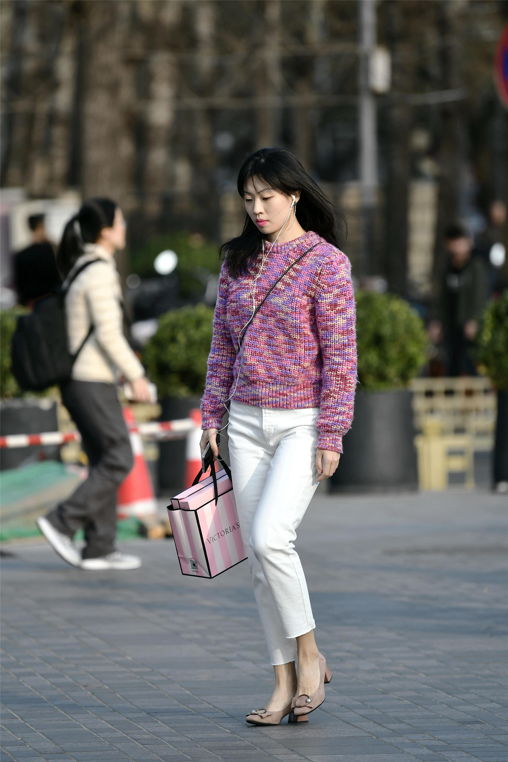 在春天明快的色调,会让人看着很愉悦,这位姑娘穿着一件渐变色的针织长袖,保暖效果非常好,有着红色,粉色和紫色混搭在一起,让人看着非常精神,一条白色的修身裤子,垂性很不错,九分的长度,一双浅灰色粗跟鞋,细跟不高,浅口设计,鞋面金属圈装饰非常精彩,一身搭配显得文静。