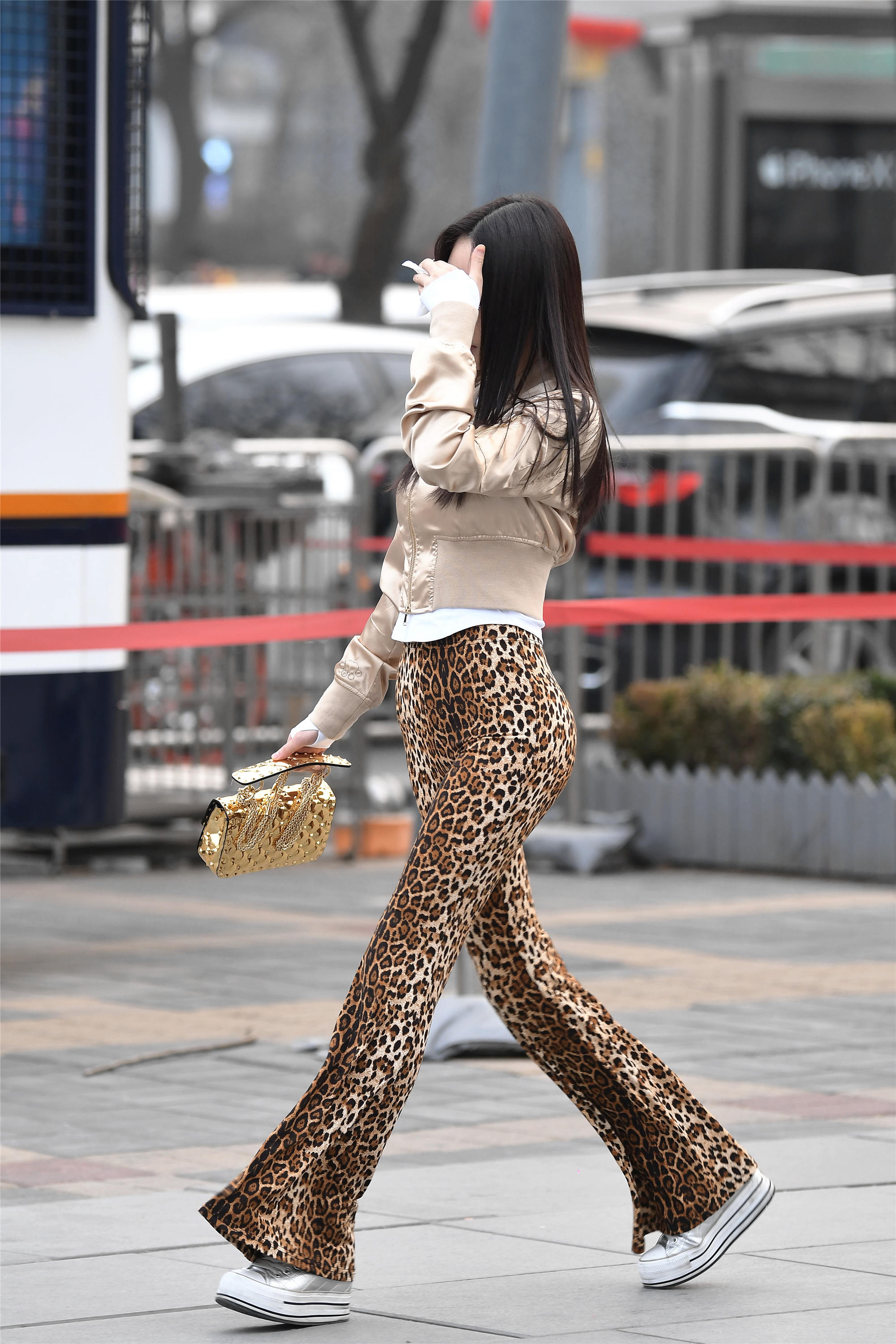 到了春天,要搭配出色彩来,会有着很不错的效果,时尚的姑娘,她们有自己喜欢的色彩,也可以搭配出不一样的春天的味道,这位小姐姐因为身材很好,应该是经常健身的,所以选择一条豹纹的长裤,大腿以上是修身效果的,显得身材曲线非常漂亮,小腿部分是散腿的,又带着一种洒脱感觉,姑娘的浅色上衣,短款而且收腰的,显腰细,也显身材比例,金属色的拎包,更是增加了色彩感。