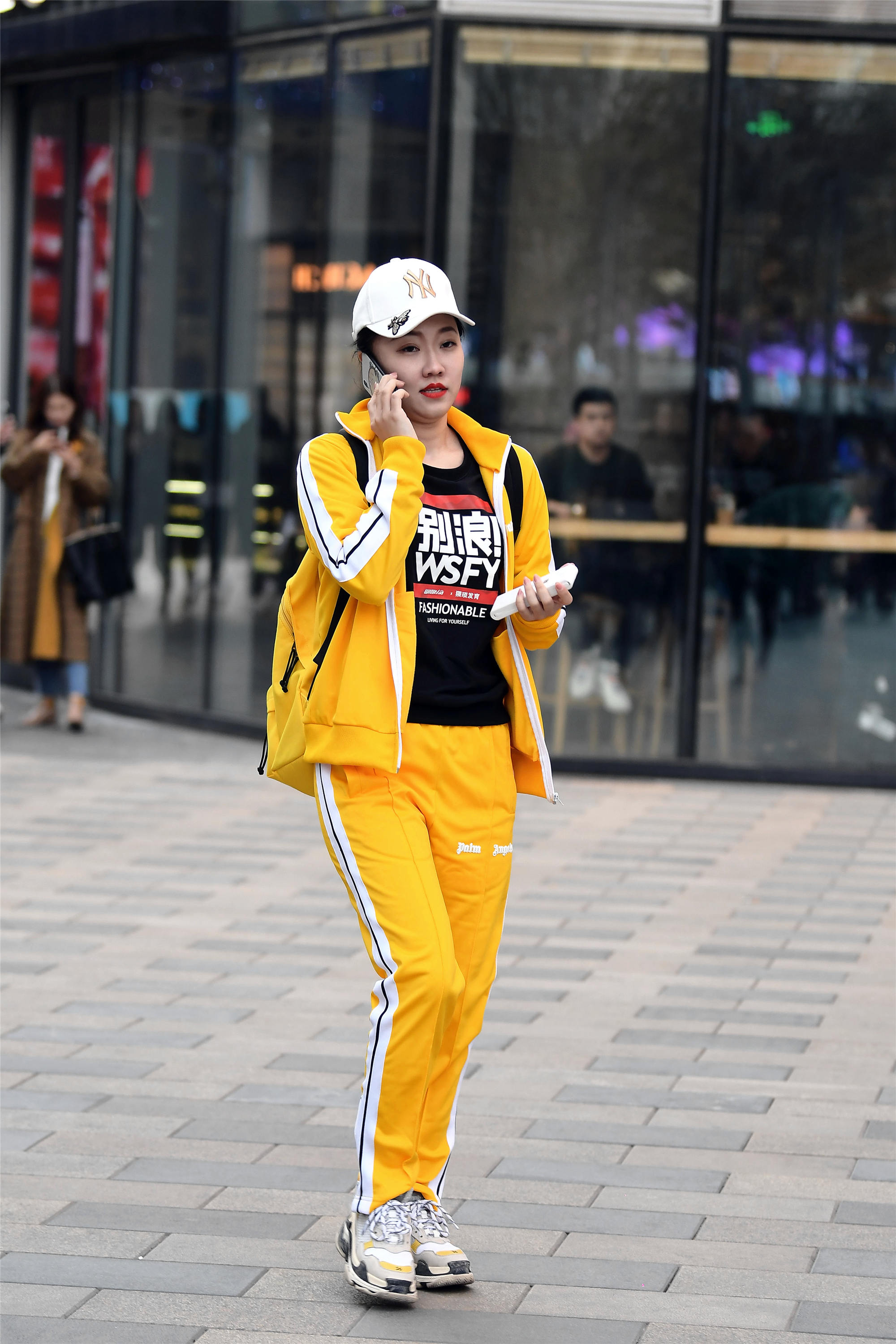 春天要有色彩,如果有了运动的色彩,是不是会有着不一样的感觉呢?这位姑娘选择一款运动套装,明黄色非常高调,侧面的白条,中间还有一道黑色,一顶白色鸭舌帽,非常显运动风的感觉,黑色的圆领内搭,也是运动风格,这样穿搭出来逛街,让春天有了不一样的色彩,春天也是运动的季节。