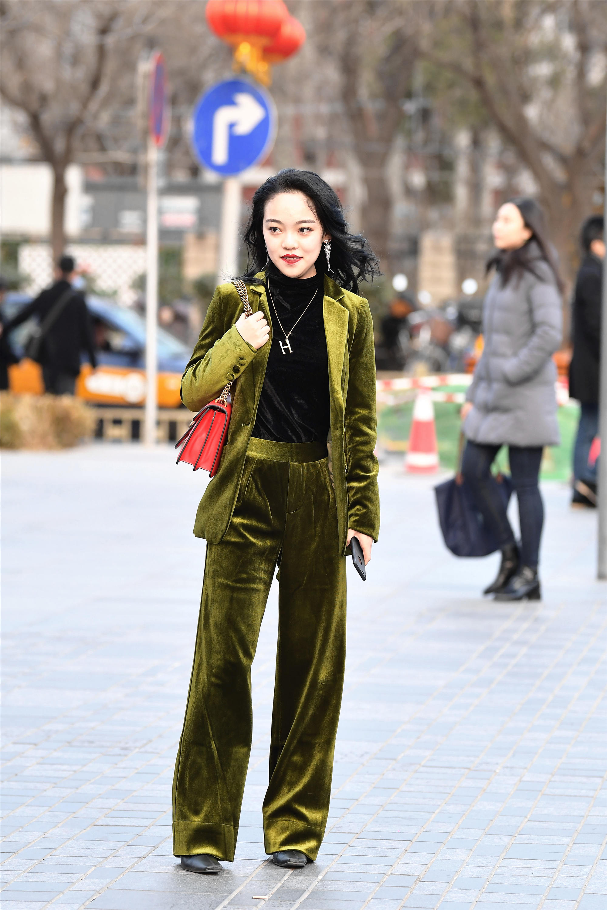 小姐姐这一件墨绿色丝绒套装,非常高级的感觉,而且随光线不同,有着不同的反光效果,增加层次感,高腰的阔腿裤与西装的组合,显得人很正式,搭配黑色高领衫,其实搭配很简单,却非常靓丽,而且也非常显身材比例,你会在春天这样搭配出门么?喜欢休闲西装的姑娘,可以搭配一下这样的服装,看起来效果很不错。