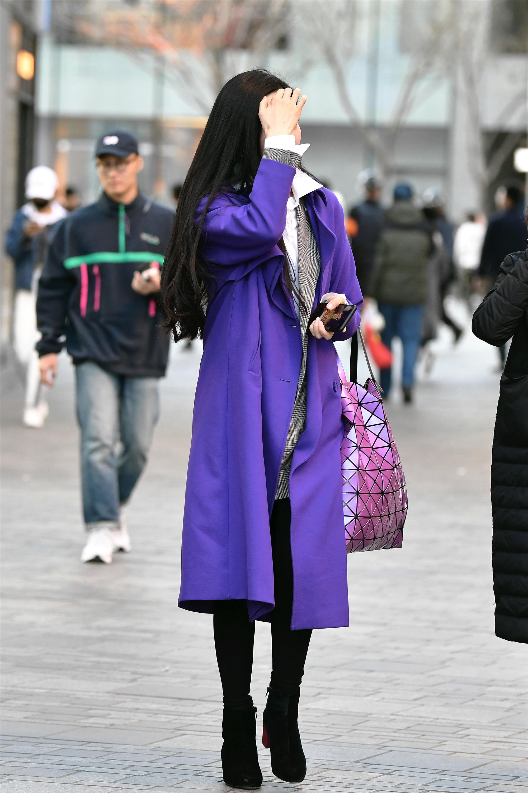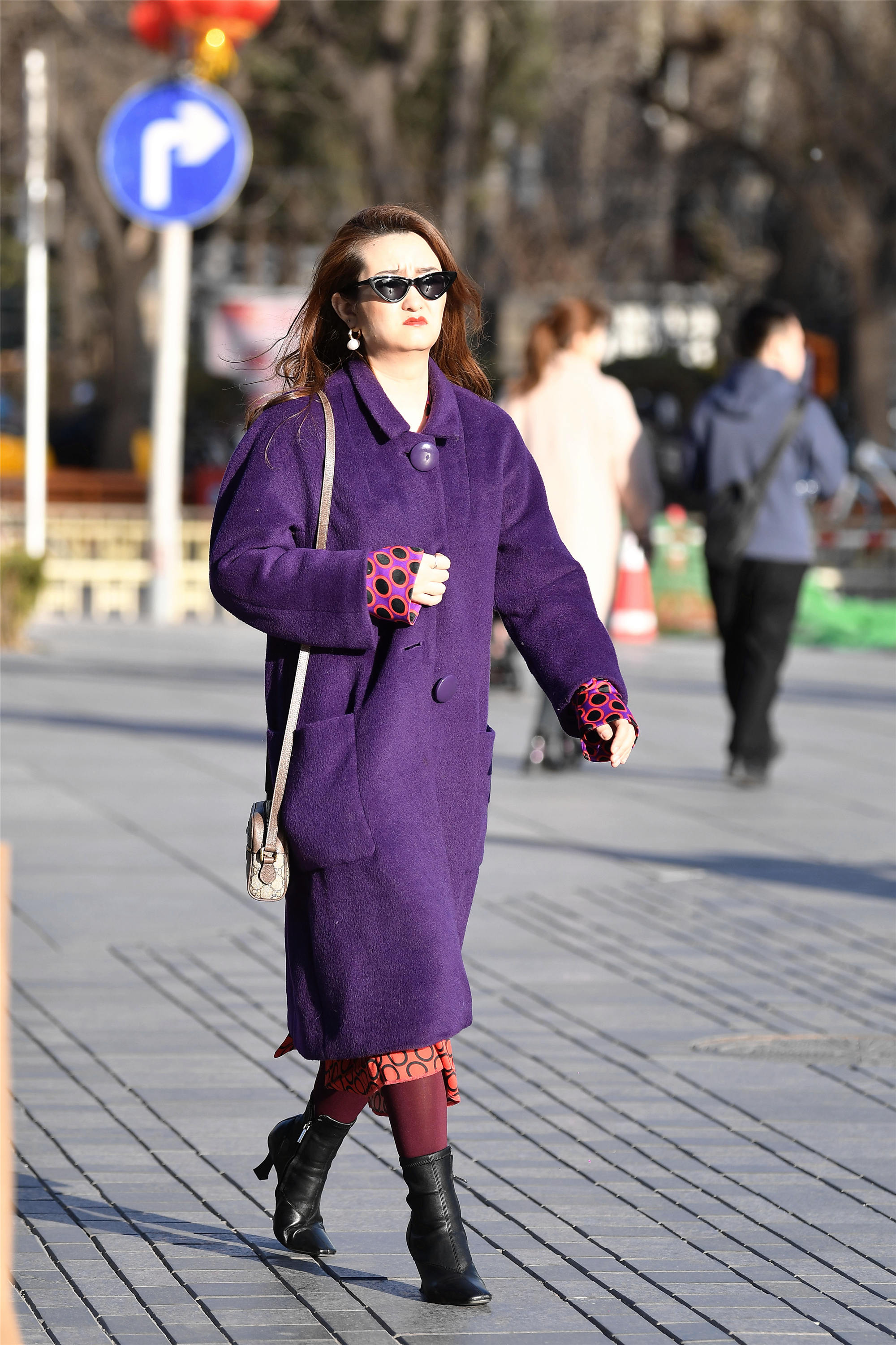 每个人都有着自己喜欢的色彩,怎么把自己喜欢的色彩展现出来,也是需要下功夫的,这位姐姐一件紫色的毛呢外套,色彩非常漂亮,而且也搭配着别的色彩,但是只露出一点点,就让你知道她的内搭是非常漂亮的,露出裙摆边缘红色底,黑色圆圈点缀,绛红色的打底裤搭配一双黑色平头短靴,鞋跟不高却是很有特点的,非常时尚。