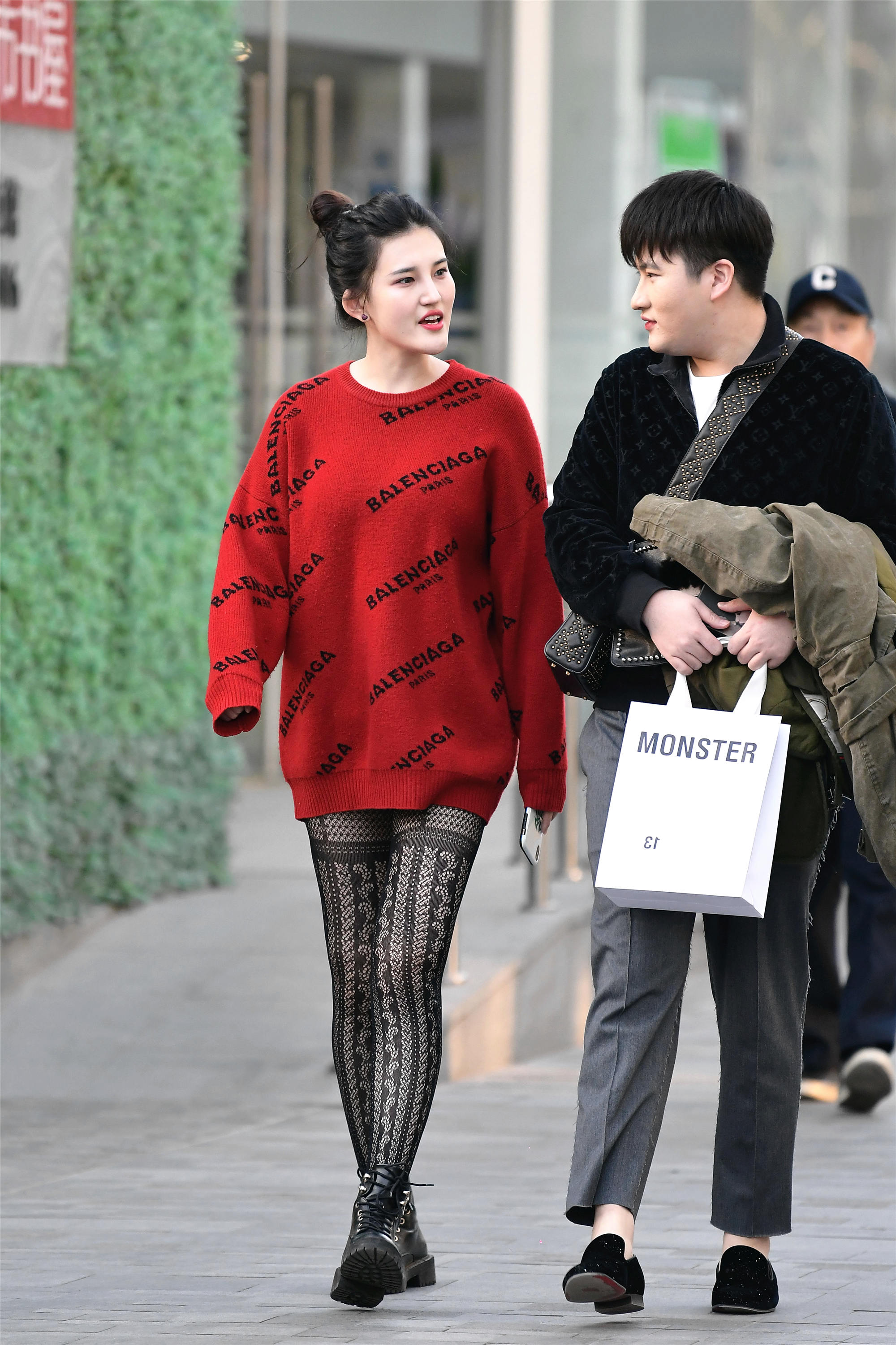 当然了,春天怎么能够少得了红色呢,红色很容易搭配出效果来,而且红色与黑色可以搭配的很经典,这位姑娘穿着一件红色针织衫,衣摆比较长,不用搭配短裙都可以,这样穿着更加的简单,一双黑色网袜,形成了经典色彩组合,黑色马丁短靴,鞋底很厚,也有着很不错的保暖效果,头发盘起来,这样显得脸很精致。