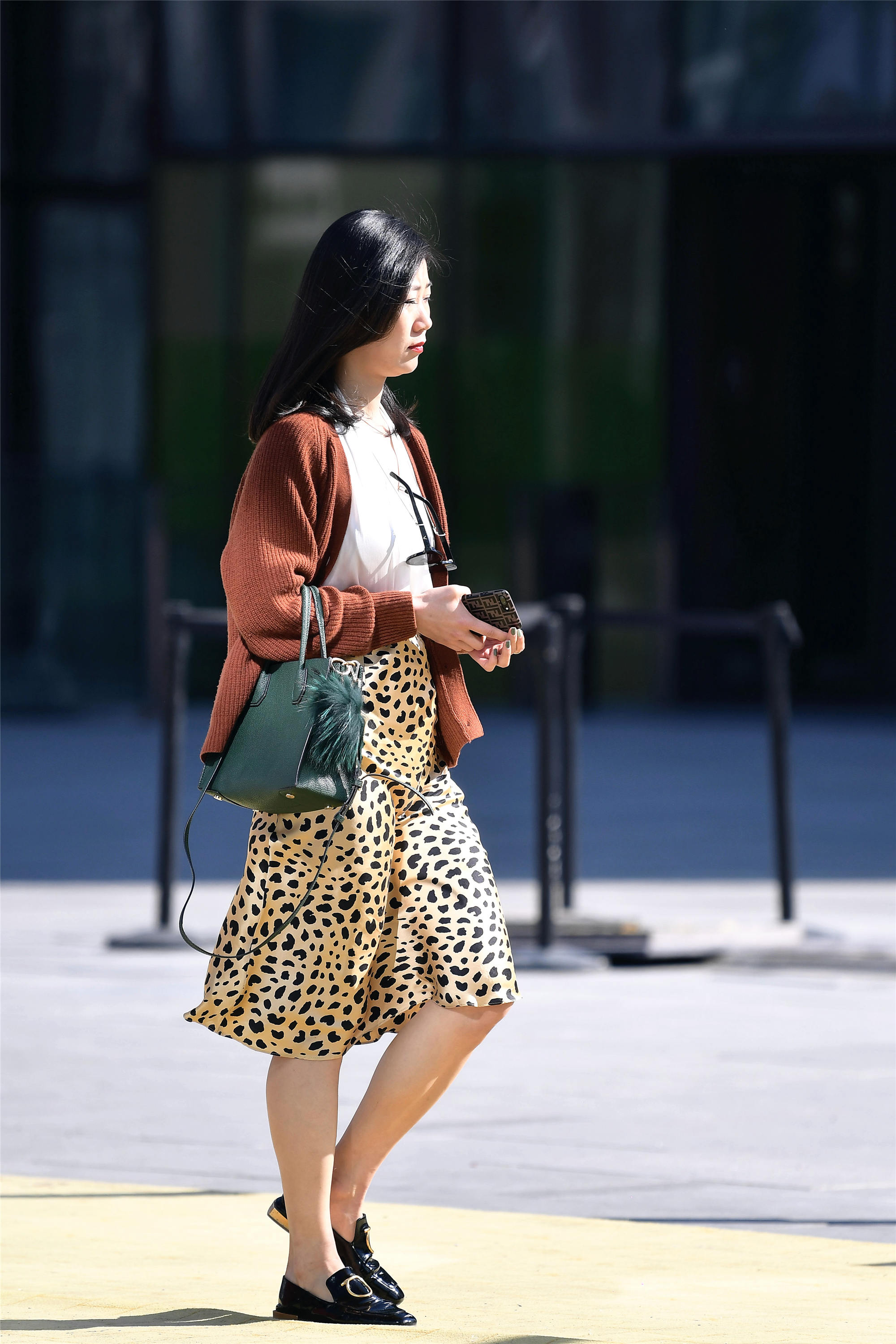 有了色彩的春天搭配,会让你觉得春天是有着自己的独特魅力的,不同的姑娘都选择不一样的色彩,如果是你,会选择怎样的服装,什么样的色彩呢?这位姑娘选择经典的豹纹款式半身长裙,宽松的款式,更加舒适,裙摆过膝,露出小腿,搭配一双黑色平底皮鞋,非常有质感,一件棕色针织开衫和白色内搭,很时尚的色彩搭配。
