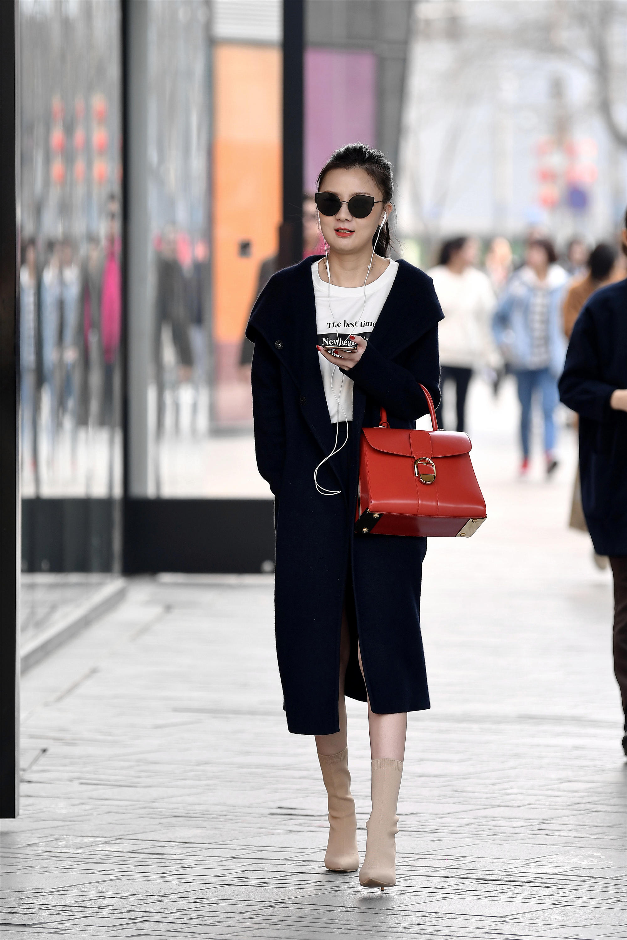 春天的黑色风衣,也有简约款式的,身材骨感的姑娘,可以选择这一款,让人高挑显瘦,而且春天姑娘穿着风,衣喜欢不系扣子,这样会展示一下内搭,白色的圆领T恤,形成了黑白色的搭配,一双肉色高跟袜靴,显得姑娘腿细,又增加身材高度,红色的拎包,直接搭在臂弯里面,很显眼的位置和色彩,头发全都梳到后面扎起来,看着人很干净。