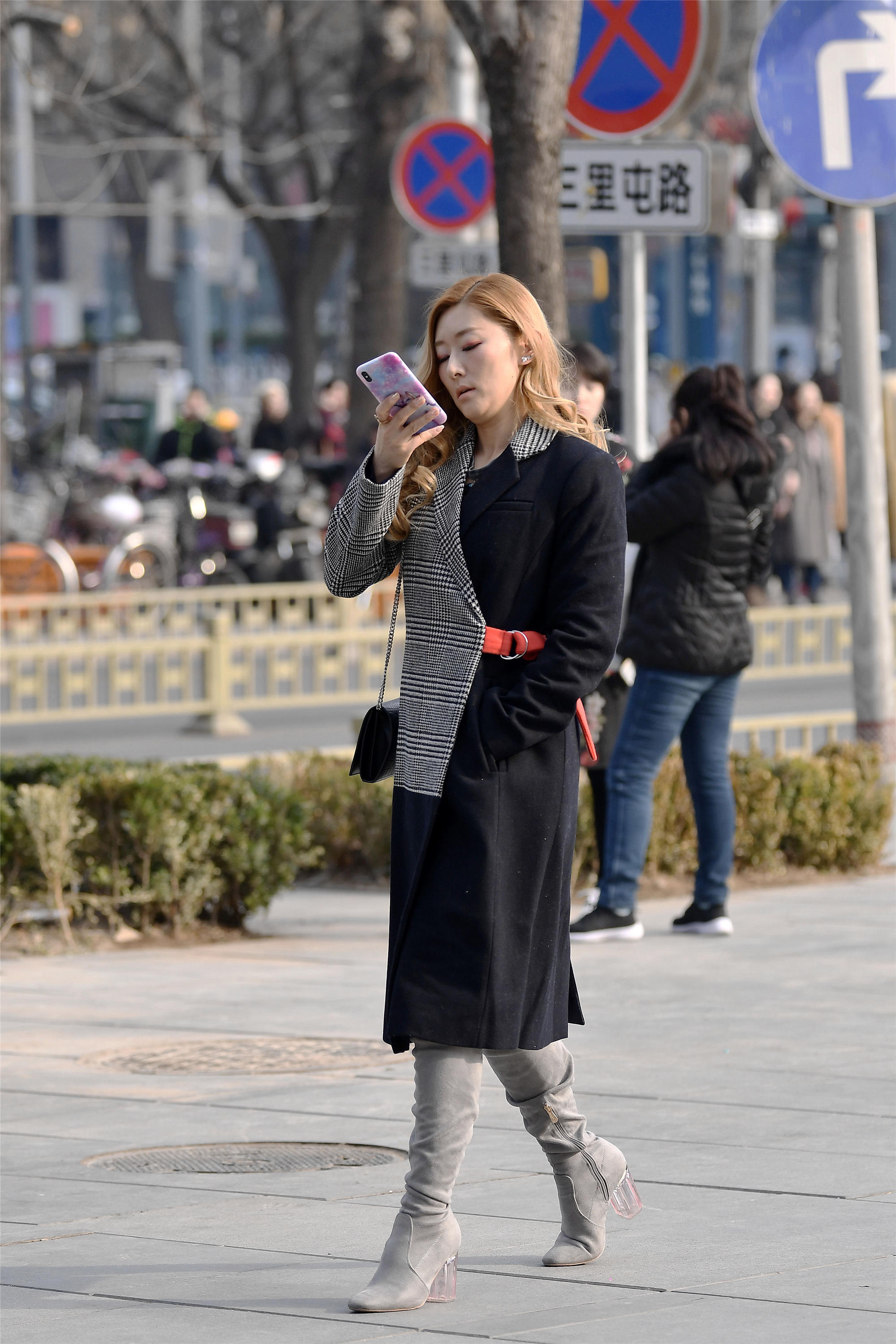 这款拼接色的风衣,也是很流行的,有不少人穿,而每个人选择的款式和色彩都不一样,所以穿着出来时非常个性的,灰色格子和黑色混搭在一起非常不错,像是两件衣服拼接在一起,灰色格子其实是黑色和白色细格子混搭在一起的效果,而且用一个红腰带系一下,让你感觉身材比例非常好,搭配一双灰色水晶跟的长靴,粗水晶鞋跟,透明的效果,略带粉红色。