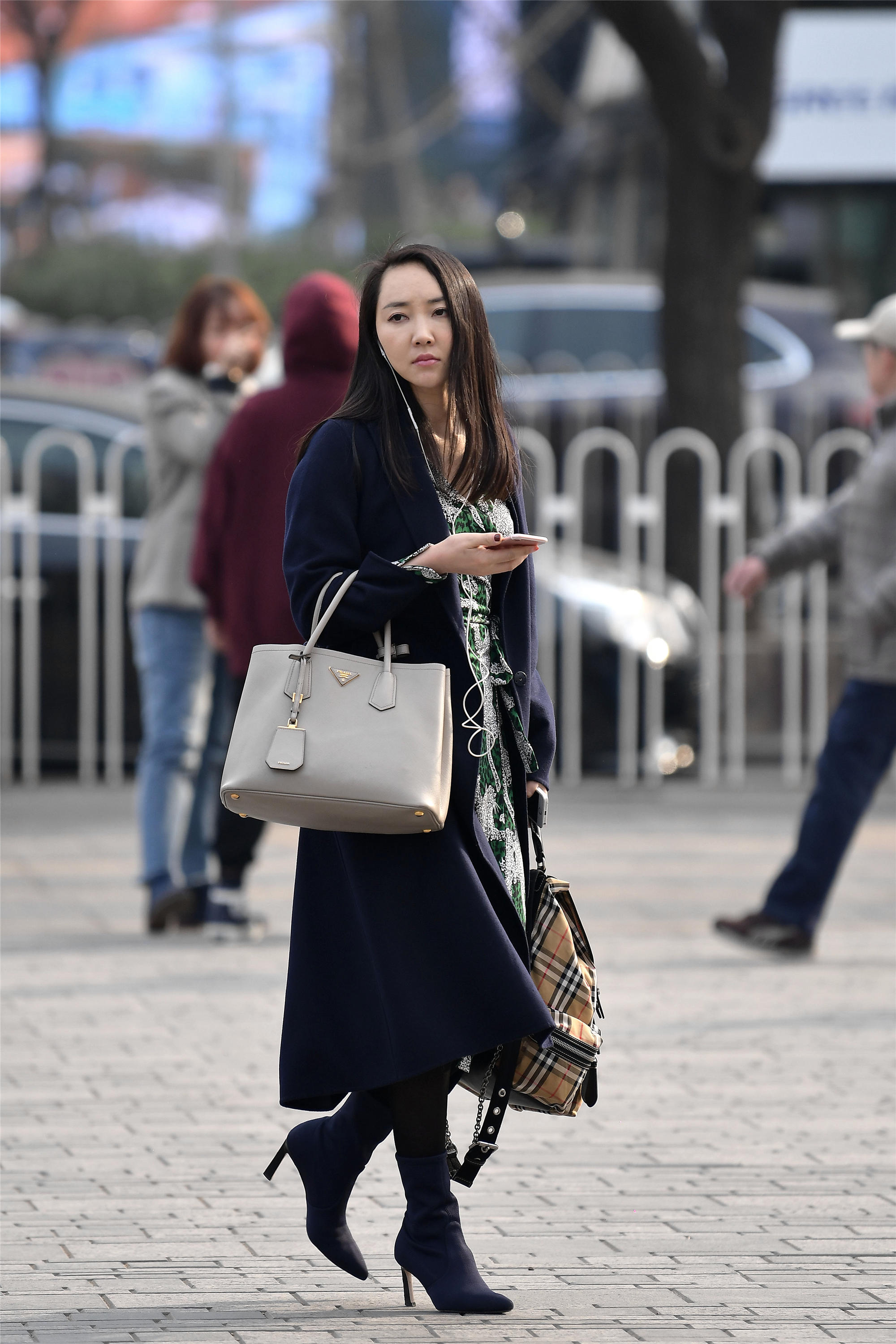 喜欢穿搭的姑娘,到了春天她们都会出门展示自己,风衣是很不错的服装,长款的风衣会让搭配变得更加简约,这位姐姐搭配一件深蓝色的长款风衣,还有一条白色与绿色的印花长裙,显得非常时尚漂亮,搭配一双黑色高跟短靴,让她身材看起来更显高挑,很多时尚姑娘喜欢高跟靴,也都可以驾驭,是可以提升气质的。