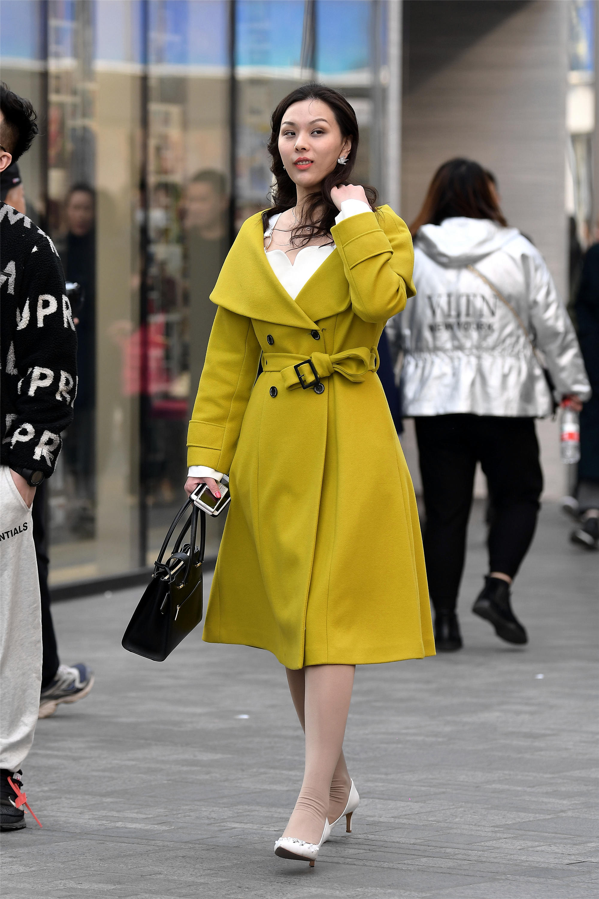 这位姐姐选择这款黄绿色风衣,带着一点糖果色的感觉,而且大的V领款式,露出白色内搭,扣子系起来,看着才更有效果,而且腰带也打一个蝴蝶结,这样有着细腰的效果,衣摆下面散开一些,显得非常有格调,肉色丝袜搭配一双白色高跟单鞋,鞋跟不高,却衬托出一种优雅的气质感觉,穿着风衣,选择鞋子也是很重要的。