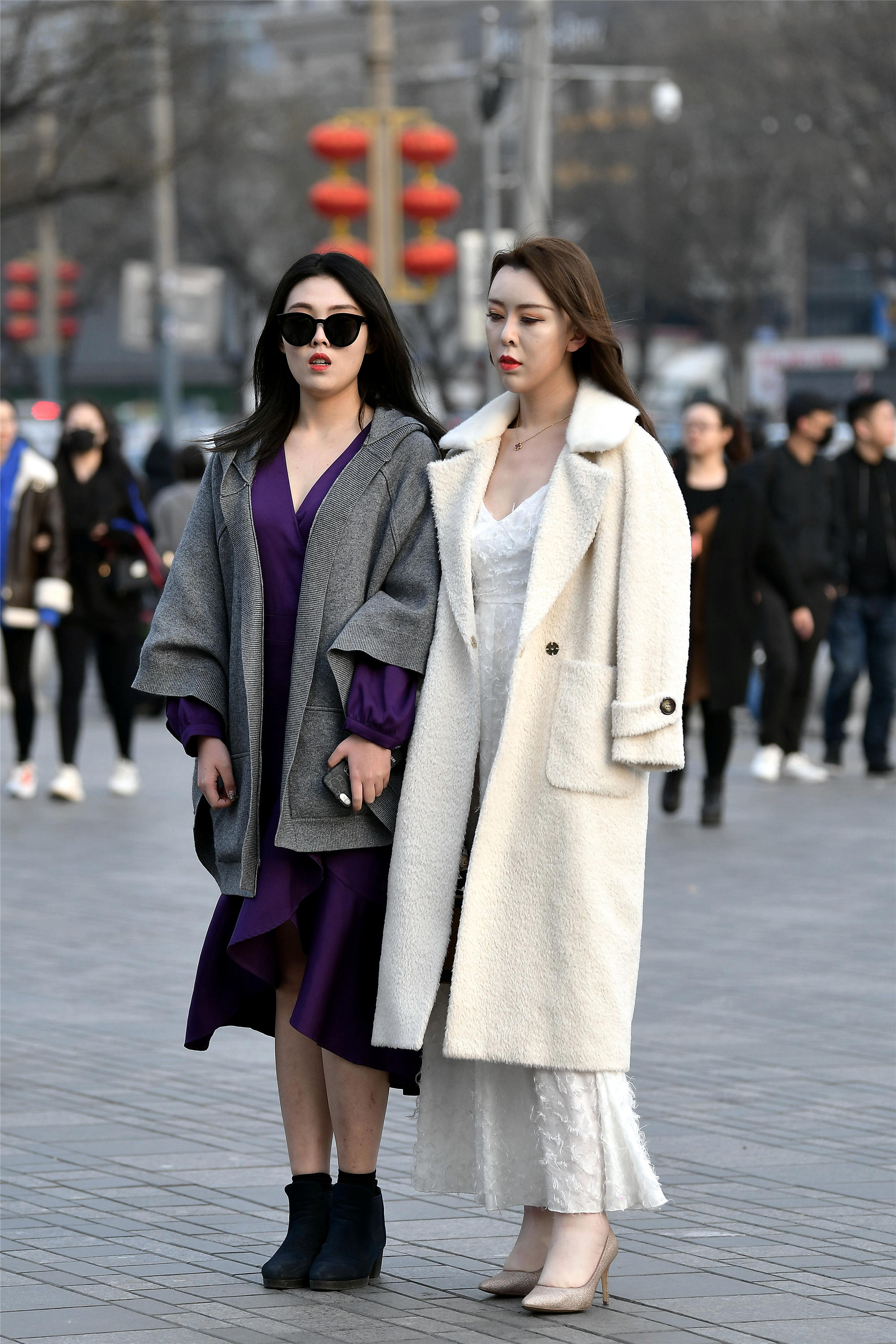 这两位姐姐,作为要好的闺蜜,她们也很会搭配衣服,浅色系和深色系搭配在一起,非常个性,一位是米白色的风衣披在肩上,搭配一着一款白色的连衣长裙,长裙有点毛绒的效果,增加层次感,更像是一件礼服,搭配一双细高跟单鞋,裙子和风衣都衬托的特别漂亮,她的闺蜜是一件灰色休闲上衣,松散的效果非常好看,一条紫色的连衣裙,裙摆过膝,低调又透着优雅的感觉,搭配一双黑色高跟短靴。