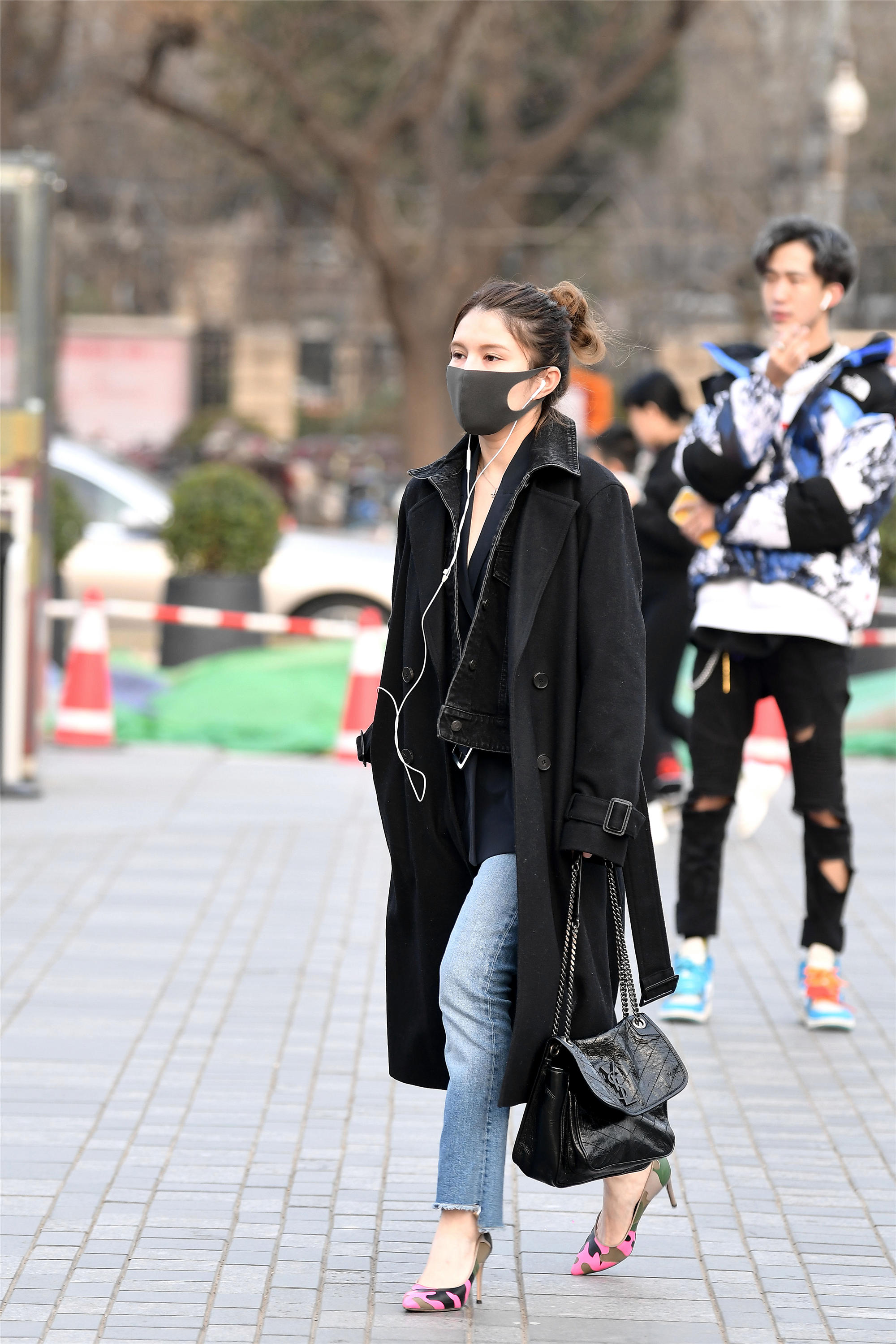 风衣在春天,搭配出休闲风格的也有很多,这位姐姐穿着这款休闲的风衣,衣襟自然垂下,露出里面的搭配,短款的黑色牛仔夹克,蓝色牛仔裤,裤脚前后错开剪了一下,露出脚面位置,因为她穿着一双迷彩的细跟单鞋,色彩比较眼里,软皮的黑色单肩包,拎在手里,包不大,迈步不是很大,这样会显得很优雅。