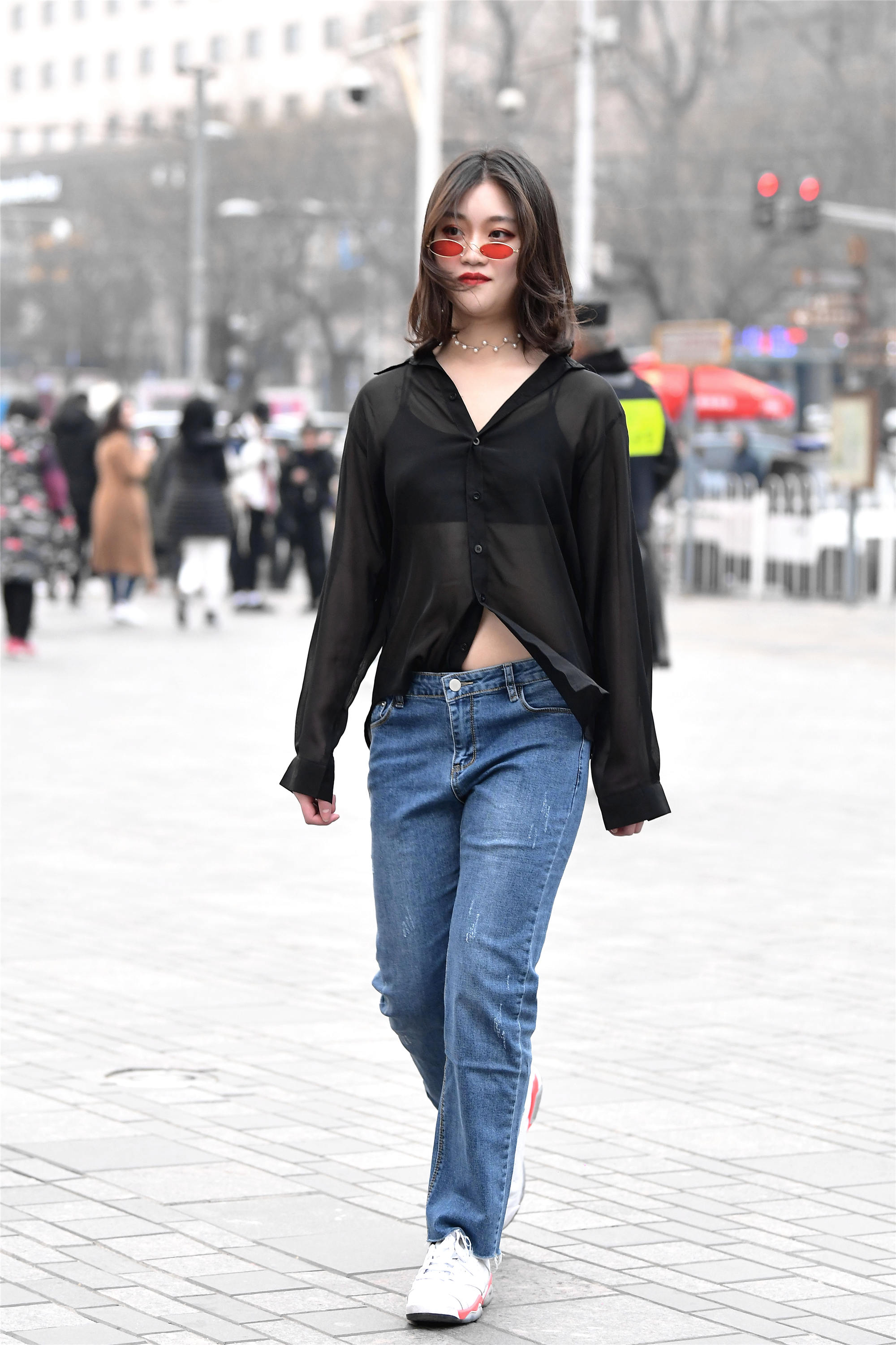 春天穿着直筒牛仔裤出门,搭配也变得简单很多,而且不挑身材,可以随意搭配,这位姑娘的搭配,非常个性,一条蓝色直筒牛仔裤搭配白色运动鞋,休闲味道十足,一件黑色衬衫,半透明的效果,三月中旬的天气,还是会有点冷,这一身搭配色彩简单,而且也很容易驾驭,非常适合春天搭配出门,也而可以带着一件夹克,感觉冷的时候就可以穿上了。