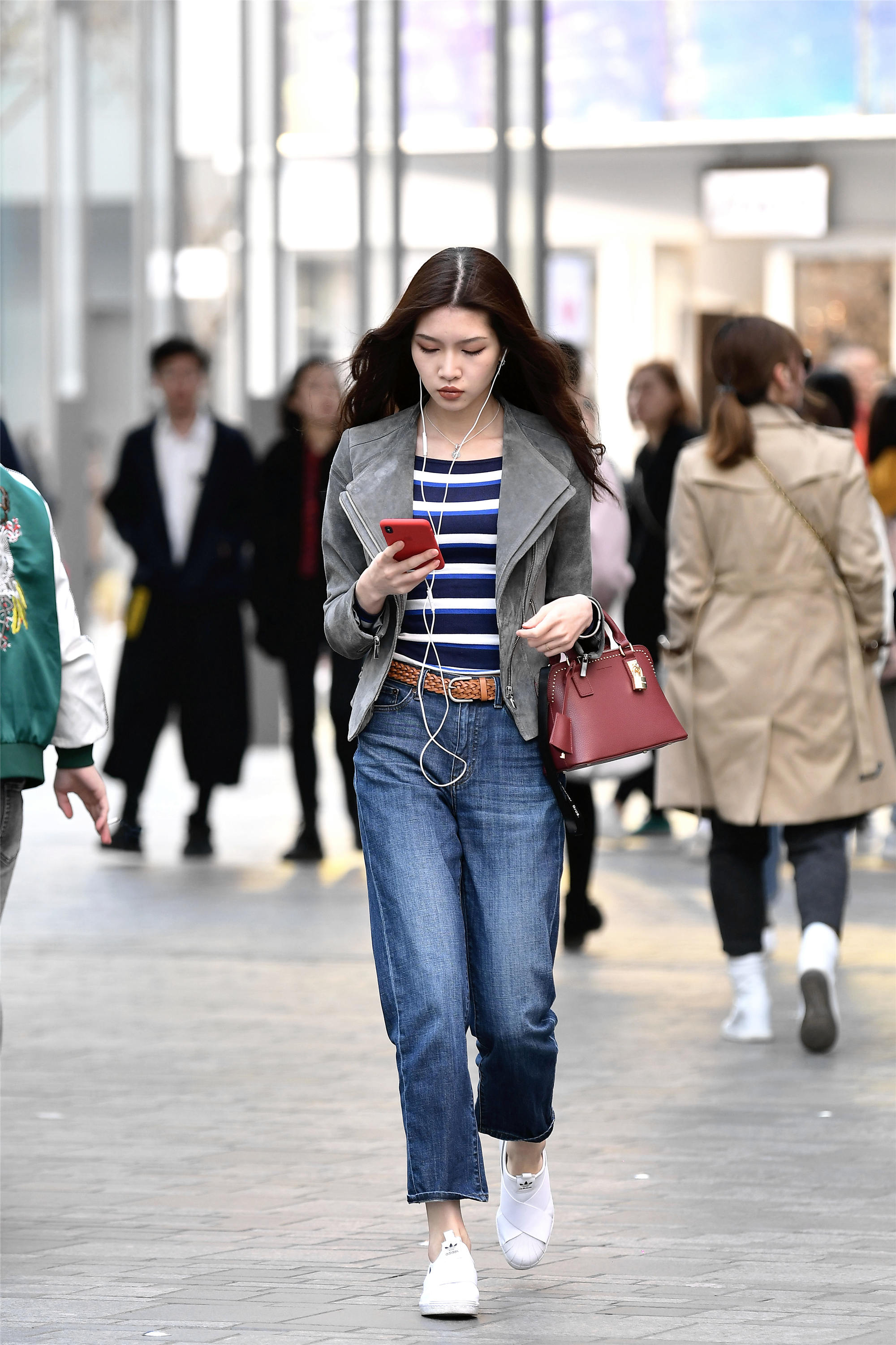 今年的北方,似乎更暖和,出来的行人也更多了,看一下这位身材高挑的姑娘,她穿着直筒的高腰牛仔裤,搭配一双橙黄色的编织腰带,腰线位置特别明显了,显得非常有身材比例,牛仔裤裤脚到脚踝位置,这样会显得姑娘身材更显高挑,穿着白色平底鞋,也很有运动感觉,横条的衬衣,显得她身材会胖一点,搭配一件灰色磨砂皮夹克,长发自然垂在后面,走路也是小步子显得文静优雅。