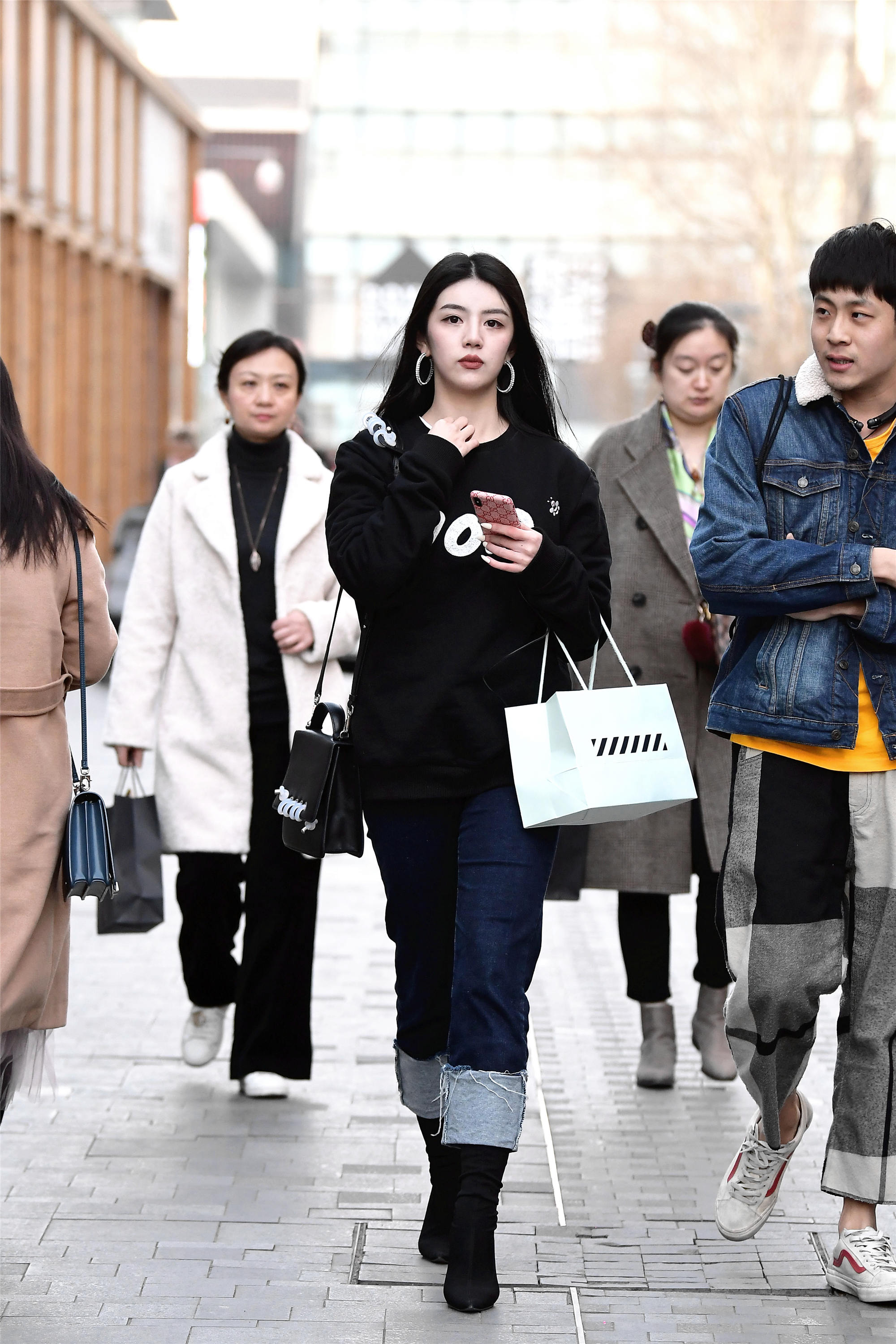 会搭配直筒牛仔裤的姑娘,她们有着自己的搭配想法,可以搭配出简约大气的风格,可以展现自己的另一种搭配格调,这位姑娘选择一款深蓝色的直筒牛仔裤,毛边的裤脚被挽起很长一段,这样为了露出她的黑色短靴,也增加色彩变化,让你注意到她的牛仔裤,搭配黑色卫衣,非常休闲的搭配方式,在她精致的五官衬托下,非常漂亮的一身搭配。