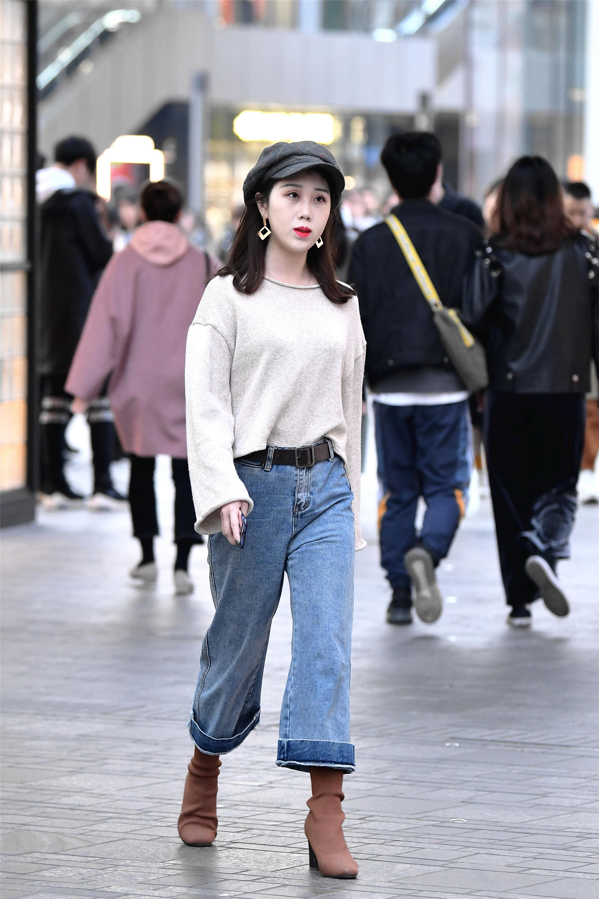直筒牛仔裤在小女生身上,也会搭配出很好的效果,会显得人干净干练,这位姑娘穿着的直筒牛仔裤,九分长度的裤腿,在裤脚位置还挽起一点点,色彩加深,搭配一双褐色高跟袜靴,和宽松的裤脚对比一下,显得人很瘦,一件灰色的小衫,前襟还特意掖在裤腰里面,高腰的牛仔裤,这样更显身材比例,黑色帽子装饰一下,小女生也可以搭配的很漂亮。