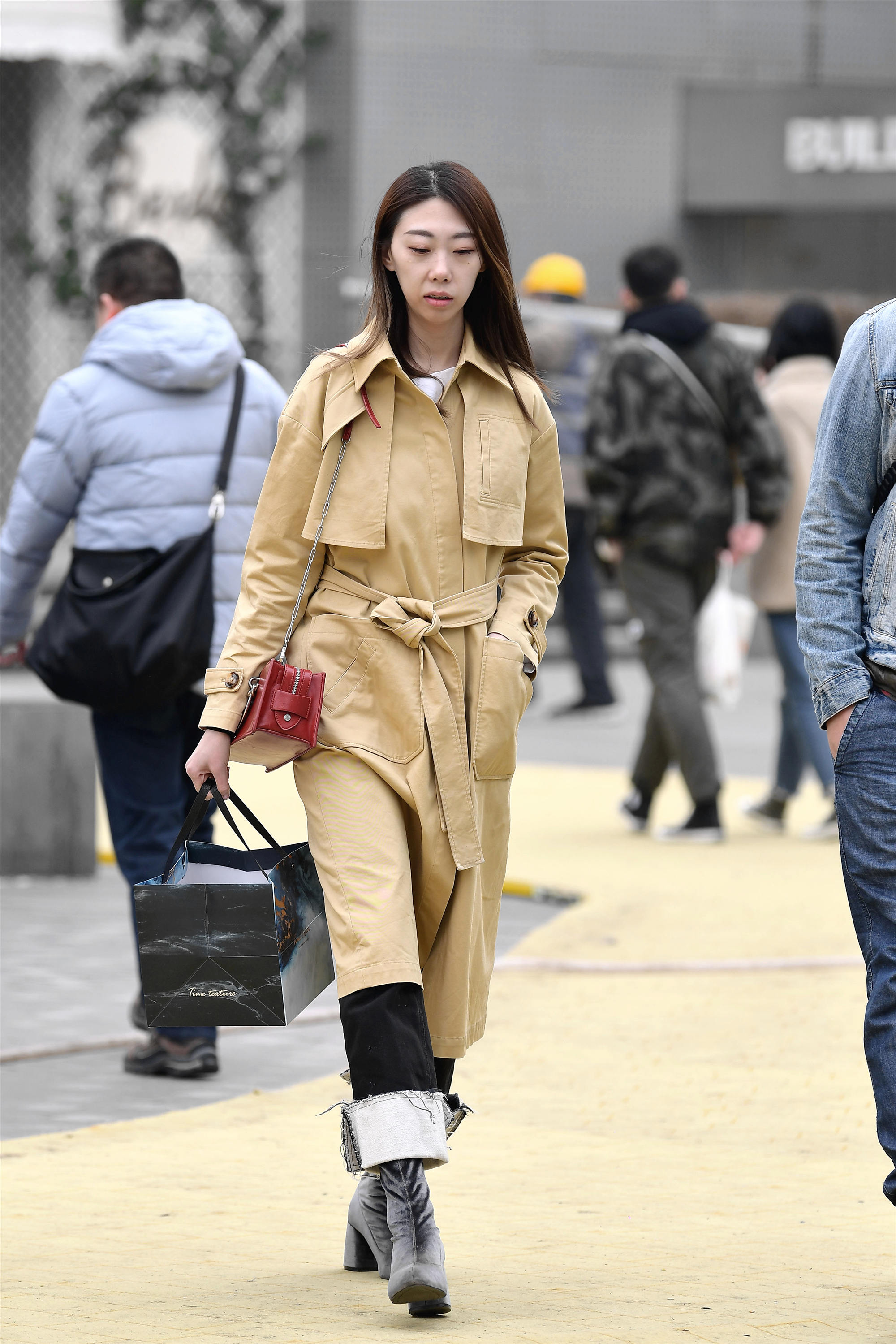 春天的搭配,有着春天的特点,看着她们的搭配,你就会知道是这个季节,百搭的直筒牛仔裤,可以在春天好好的搭配一下,这位时尚姑娘选择一款黑色直筒牛仔裤,裤脚挽起一段,这样将她的灰色短靴,展示出来,一件黄色的风衣,腰带挽成一个节,增加层次感,让身材比例看起来更好,高挑身材这样搭配会有着很不错的效果。