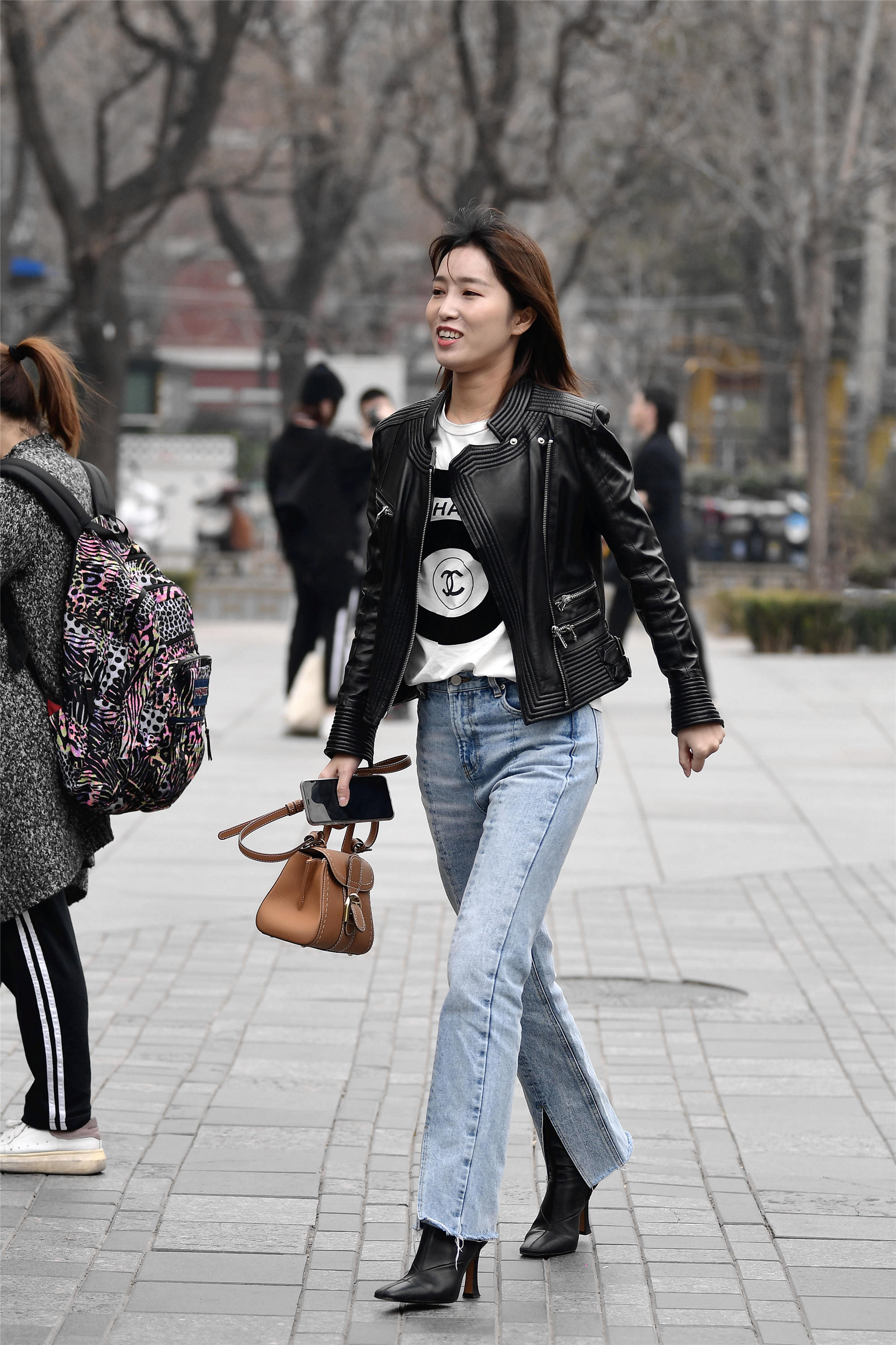 直筒牛仔裤搭配皮夹克,这样有季节特点的搭配,而且简约的风格,还非常显气质,黑色皮夹克,领口和前襟的压褶设计,非常时尚,增加层次感,而且很多金属拉链,这样也增加质感,香奈儿的衬衣,黑白色对比,也非常好看,浅蓝色的直筒牛仔裤,让她看起来神身材更高挑和显瘦,一双高跟短靴,让她身材更高挑。