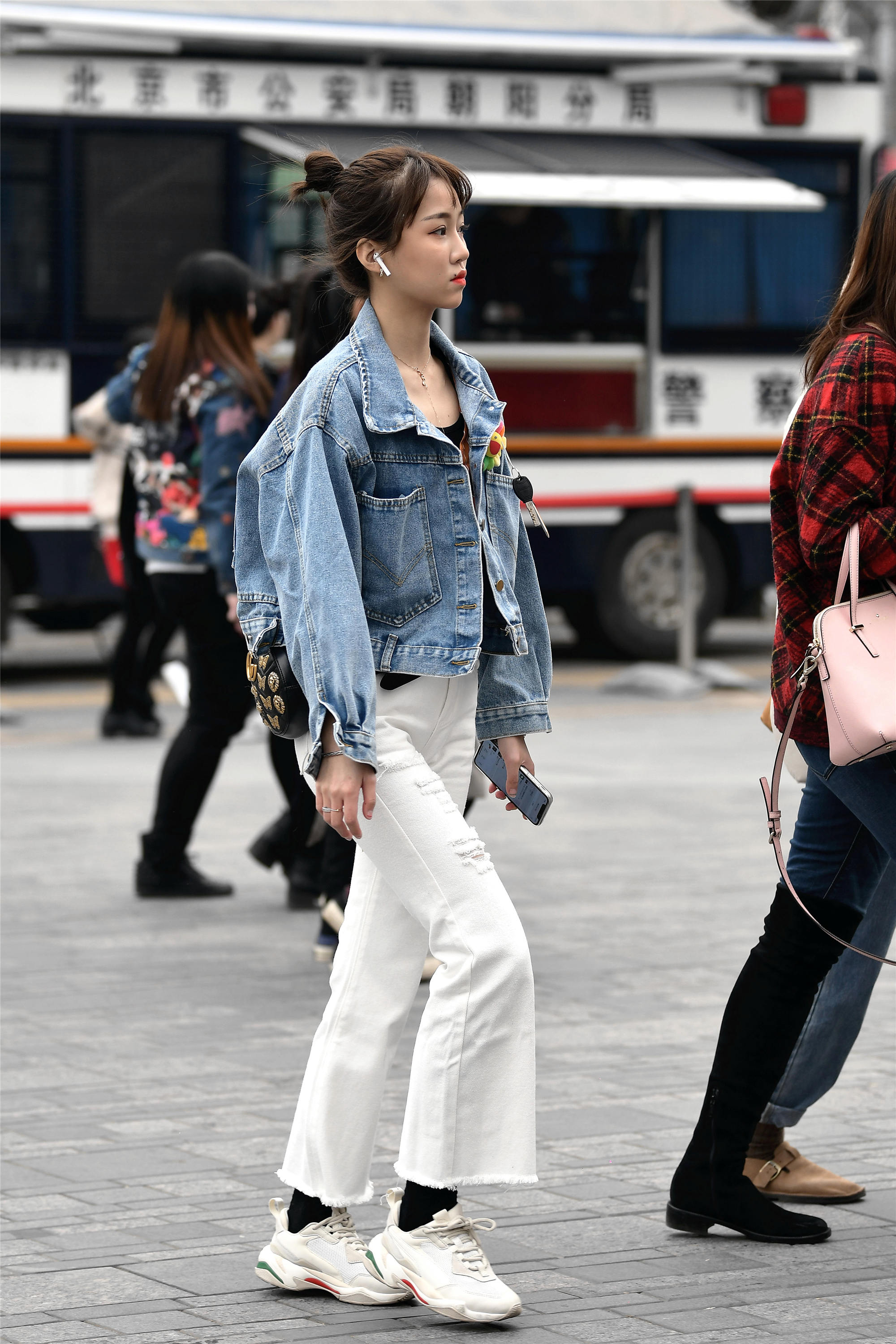 这位姑娘选择一款白色直筒牛仔裤,上面的破洞和猫抓,非常个性,裤脚的毛边也增加效果,搭配一双浅灰色运动鞋,休闲的风格搭配,一件蓝色的牛仔服,短款的衣襟,长袖,这样对比非常漂亮时尚,也有着很不错的显身材比例效果,扎起丸子头,也是很时尚的发型,这一身春季搭配,显得人很年轻。