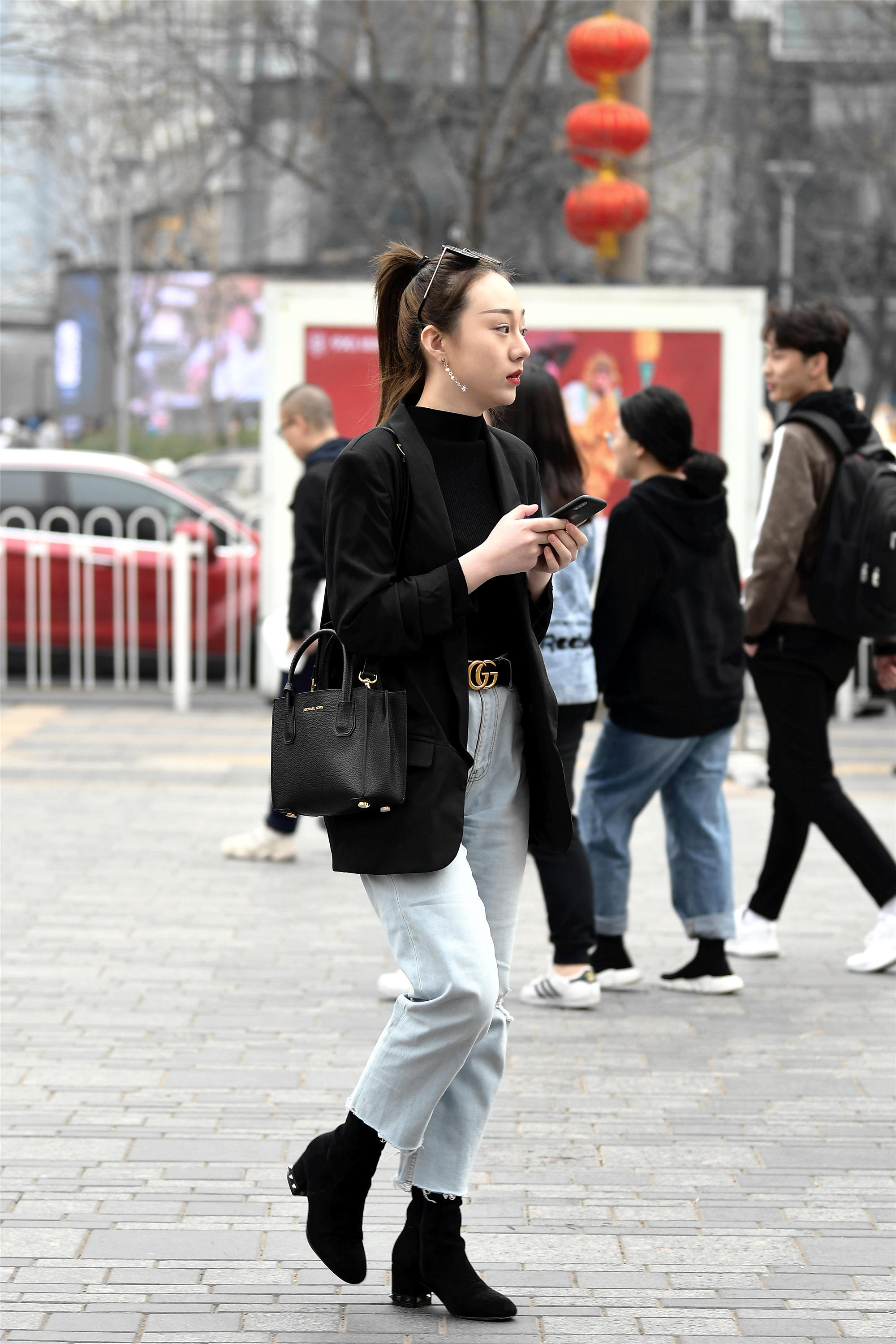 直筒牛仔裤也可以搭配出混搭风的感觉,浅蓝色水洗牛仔裤,直筒的款式,裤脚直接剪了一下,这样有着九分的长度,衬托出脚下的一双黑色短靴,姑娘选择一款黑色金属扣的腰带系在高腰牛仔裤上面,这样会有着很好的比例效果,搭配一件黑色西装,黑色的高领内搭,这样很有特点的混搭风格,非常漂亮,姑娘的头发高高的梳在后面扎起来,显得人很精致。