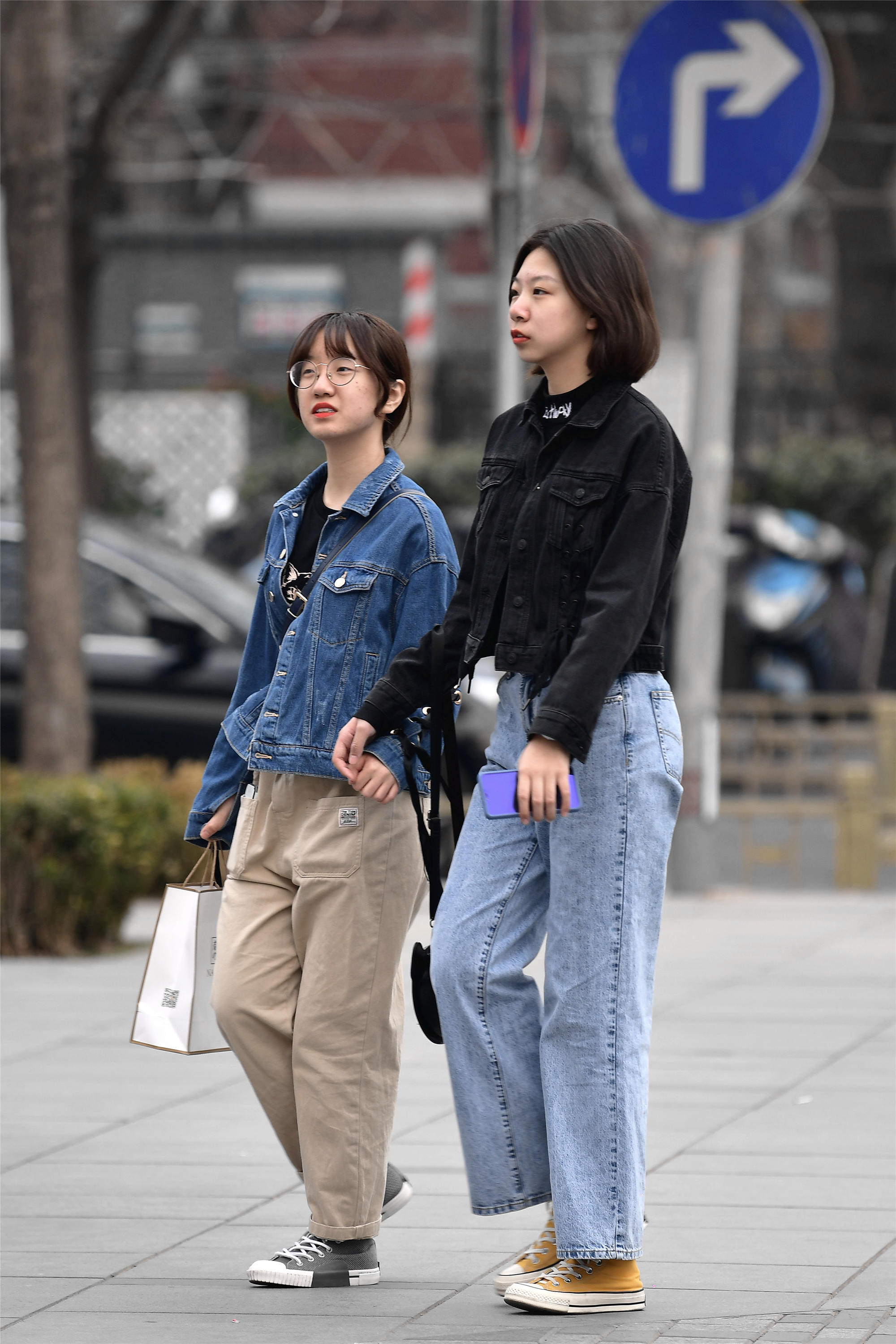 在春天出去逛街,只要自己用心搭配了,就是最好的,如果不是很会选择服装搭配,高腰牛仔裤可以降低难度,让你的穿搭变得简单,看一下这一对小闺蜜的搭配,蓝色高腰直筒牛仔裤,会显得比例很好,搭配一双帆布鞋,显得小女生气质,黑色短款的牛仔裤夹克,让风格有些相似,还有色彩对比,她的闺蜜是宽松的裤子,搭配灰色帆布鞋,深蓝色的牛仔夹克,小女生的搭配效果。