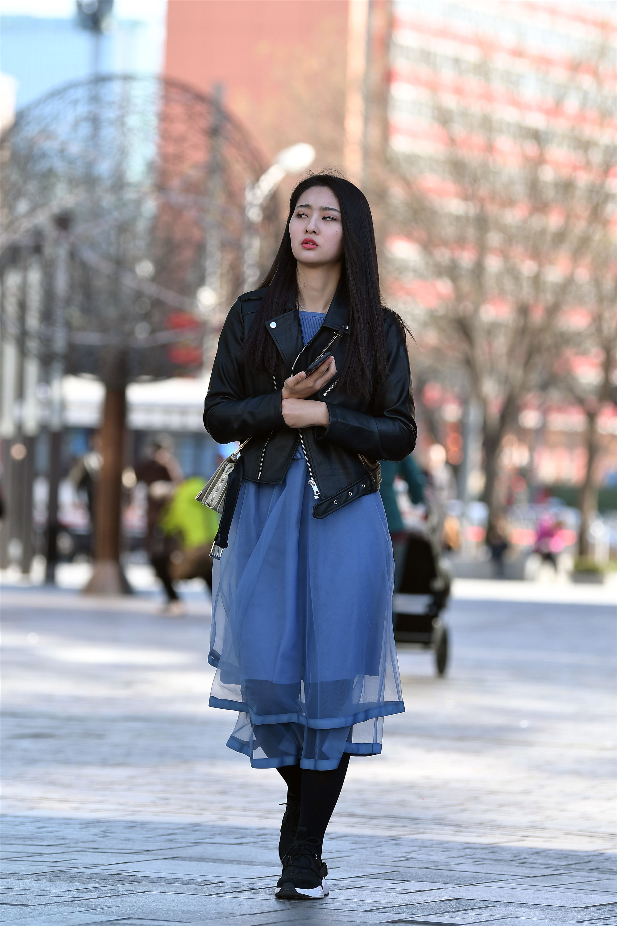 时尚,给你的不仅仅是自己着装的改变,也会让的生活有了变化,从现在开始,学习搭配,慢慢的注意你的生活,你会发现这些,在影响着你的生活,现在跟随着时尚姑娘的搭配脚步,看一下,今年春天的她们如何搭配的多姿多彩,一件绿色纱裙,还有这层次感,透视效果也非常好看,套着一件皮夹克,短款的形式,黑色裤子搭配一双黑色运动鞋,这是一身的运动风格的搭配,是不是觉得有些混搭风的感觉,身材高挑,这样一身搭配轻松驾驭。