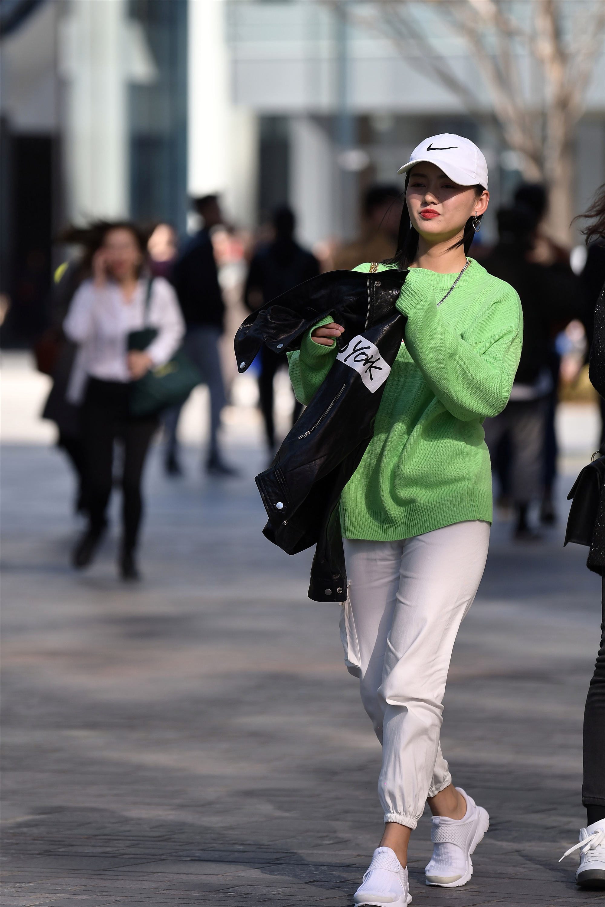 每个人都有着不同的风格,所以她们选择的春季色彩也会不一样,根据自己的喜好搭配出自己的时尚感觉来,喜欢运动风格的姑娘,会搭配出自己的运动时尚,一件长袖的毛衣,搭配一条米白色的收腿长裤,白色运动鞋和白色棒球帽,相呼应,皮夹克搭在臂弯里,这一身简单的运动风格,却有着非常时尚靓丽的感觉,匀称高挑的身材,会让搭配变得更加简单。