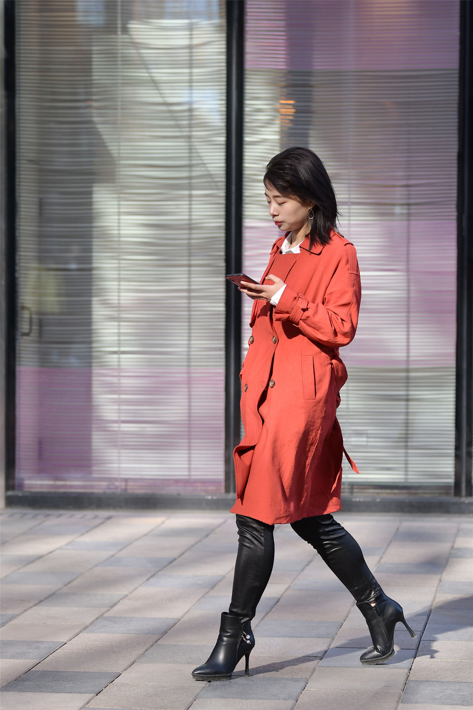在三里屯时尚街区,很多人搭配一下,要到这里来展示一下,所以这里有很多时尚搭配,春天要搭配的有色彩,想要去展示一下,可以到这里逛一下,也看看别人是怎么搭配春装的,红色,其实很多人都喜欢,红色长款的风衣,简约风格,衣摆到膝盖的位置,黑色皮裤和黑色细跟的皮短靴,经典的黑白组合,也有着修身的效果,穿着高跟鞋走路,要优雅一些,才会显得人更优美。