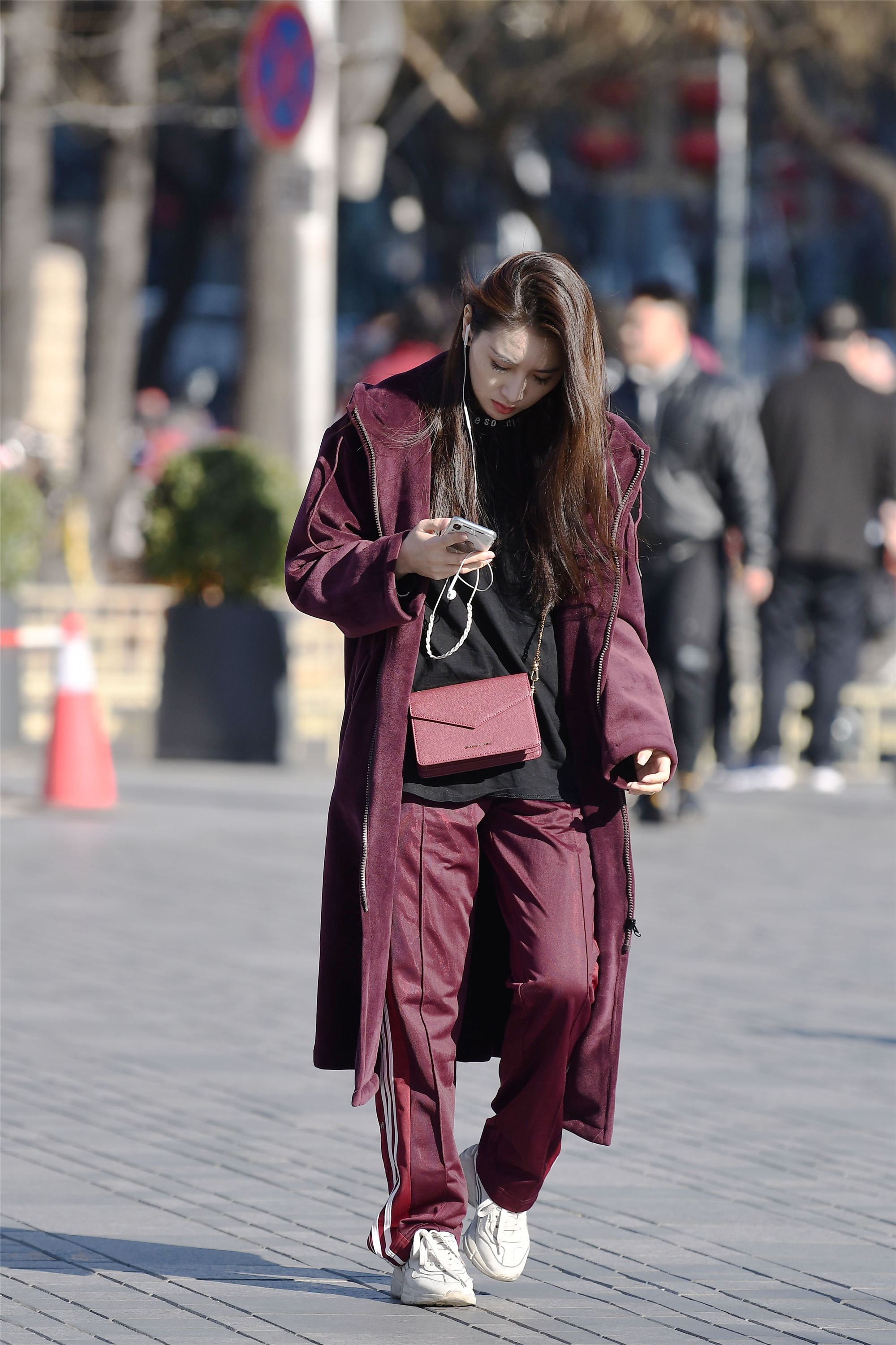 这位姑娘搭配出小女生的感觉,一件暗红色的大衣,搭配暗红色的运动裤,色彩一致,应该是一套衣服,搭配白色运动鞋出行,休闲种带着个性,黑色上衣,衣襟垂下来,不显身材比例,很自然的搭配,有着小女生的味道,粉红色的小包,搭在肩上,起到了很好的装饰作用,及腰长发垂在前边,这样会显得脸很小。