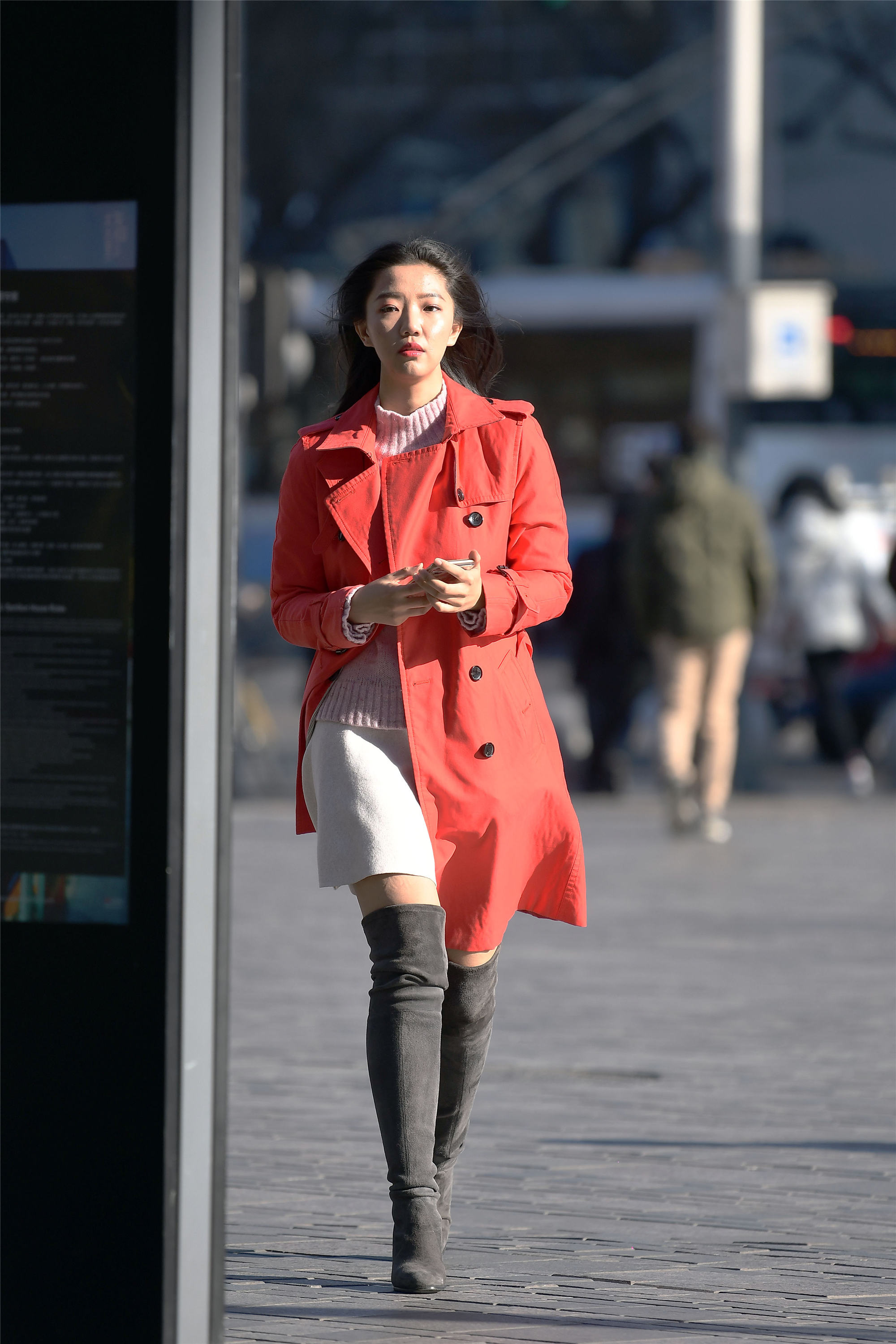时尚姑娘的自信,不仅仅是因为她们的身材,还有她们的搭配,因为可以通过搭配,让自己变得更漂亮,到时尚街区逛街,她们的步伐里面就可以看出她们对自己的自信,这位姑娘昂首挺胸,步子不大却很沉稳,带着优雅的感觉,一款红风衣,一侧衣襟飘在身后,粉红色的针织高领衫和白色短裙,深灰色的过膝靴,身材更显匀称高挑,春天就要搭配的有色彩,才觉得是春暖花开的季节。