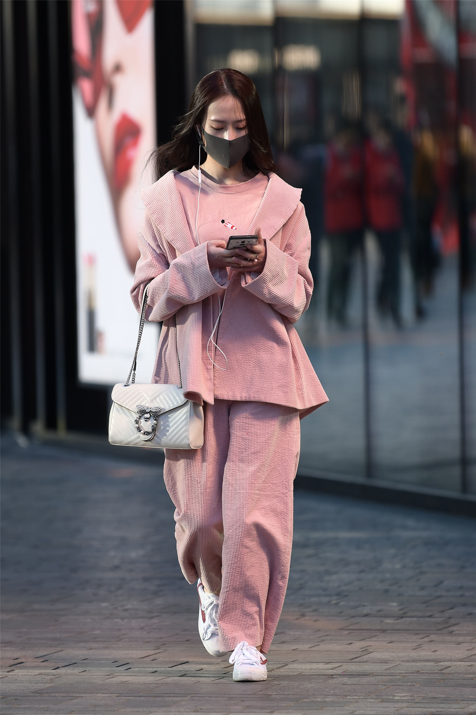 这位小姐姐的穿搭很有特点,显得非常有小女生的感觉,整体的色调采用浅粉色,这样会显得很年轻,材质用条绒的套装,有着复古的感觉,在以前的条绒搭配,主要是黑色,显得老气,姑娘选择浅粉色,却和以前有了很大的改变,宽松的衣服和裤子,休闲感觉十足,还选择浅粉色的内搭,色彩和外套非常相近,也是挑了好久才买到的吧,一双白色平底鞋,经典的帆布款式,现在又开始流行起来了。