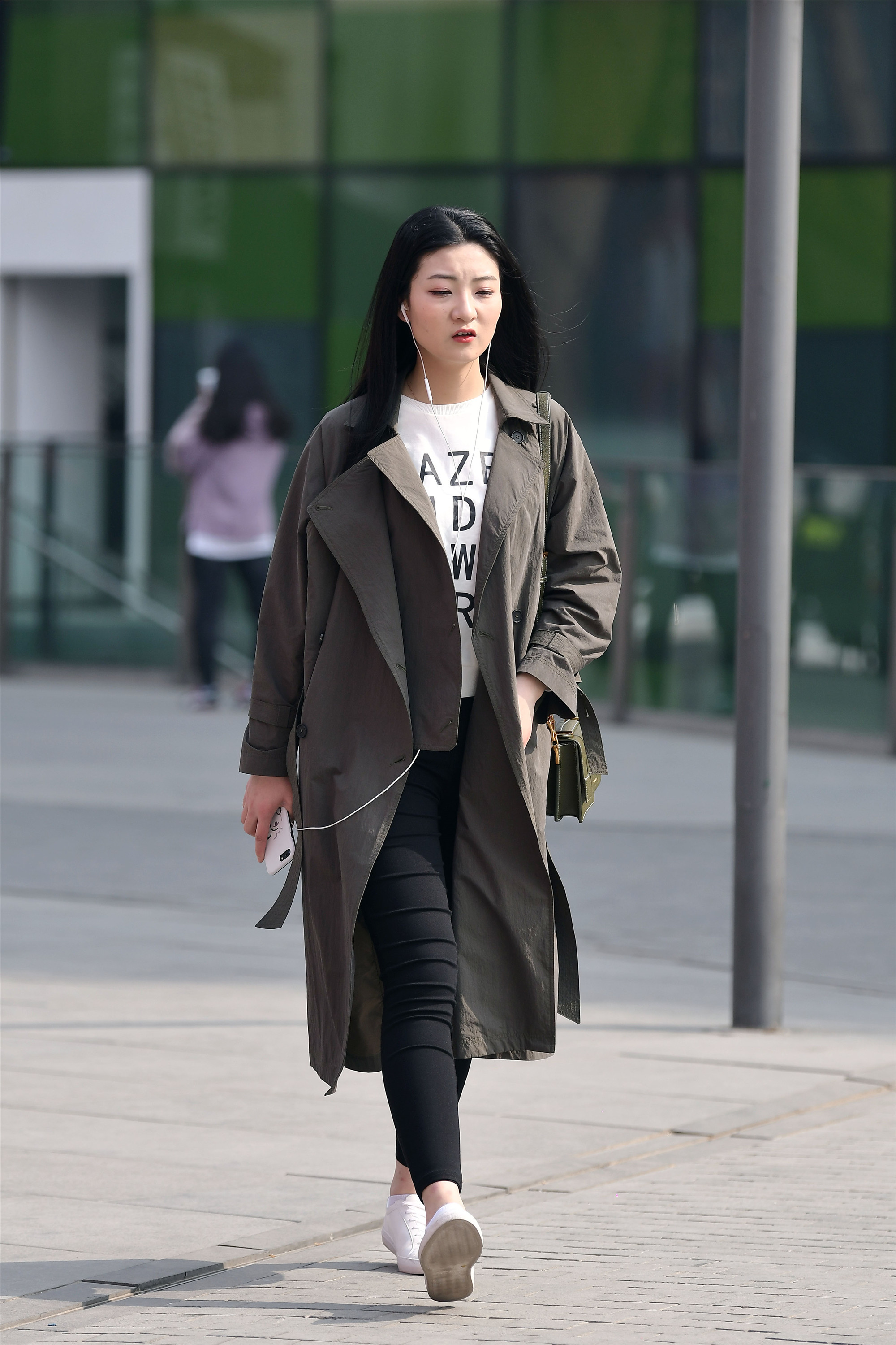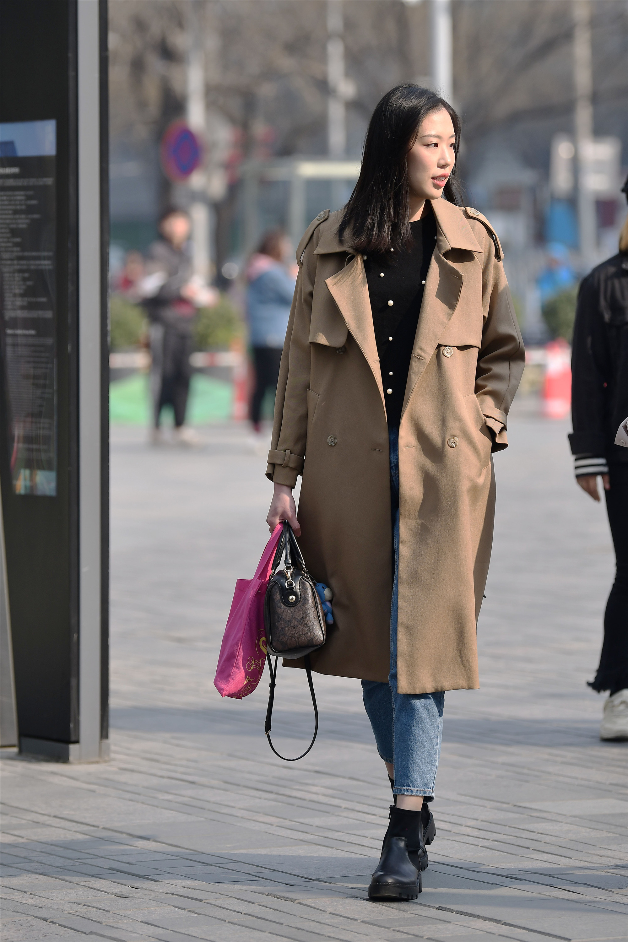 春风和煦,已经有部分树叶长出嫩芽,带来了一份绿意,樱花已经开了一部分,很多时尚姑娘也纷纷走上街头,感受春天的气息,风衣带来的风度和成熟的美感,也是很多人喜欢的,这位姑娘的卡其色长款的风衣,有点正装的味道,搭配黑色内搭,和蓝色九分牛仔裤,一双黑色皮短靴,一身简约的着装,都是常见的衣服,却搭配出不错的效果。