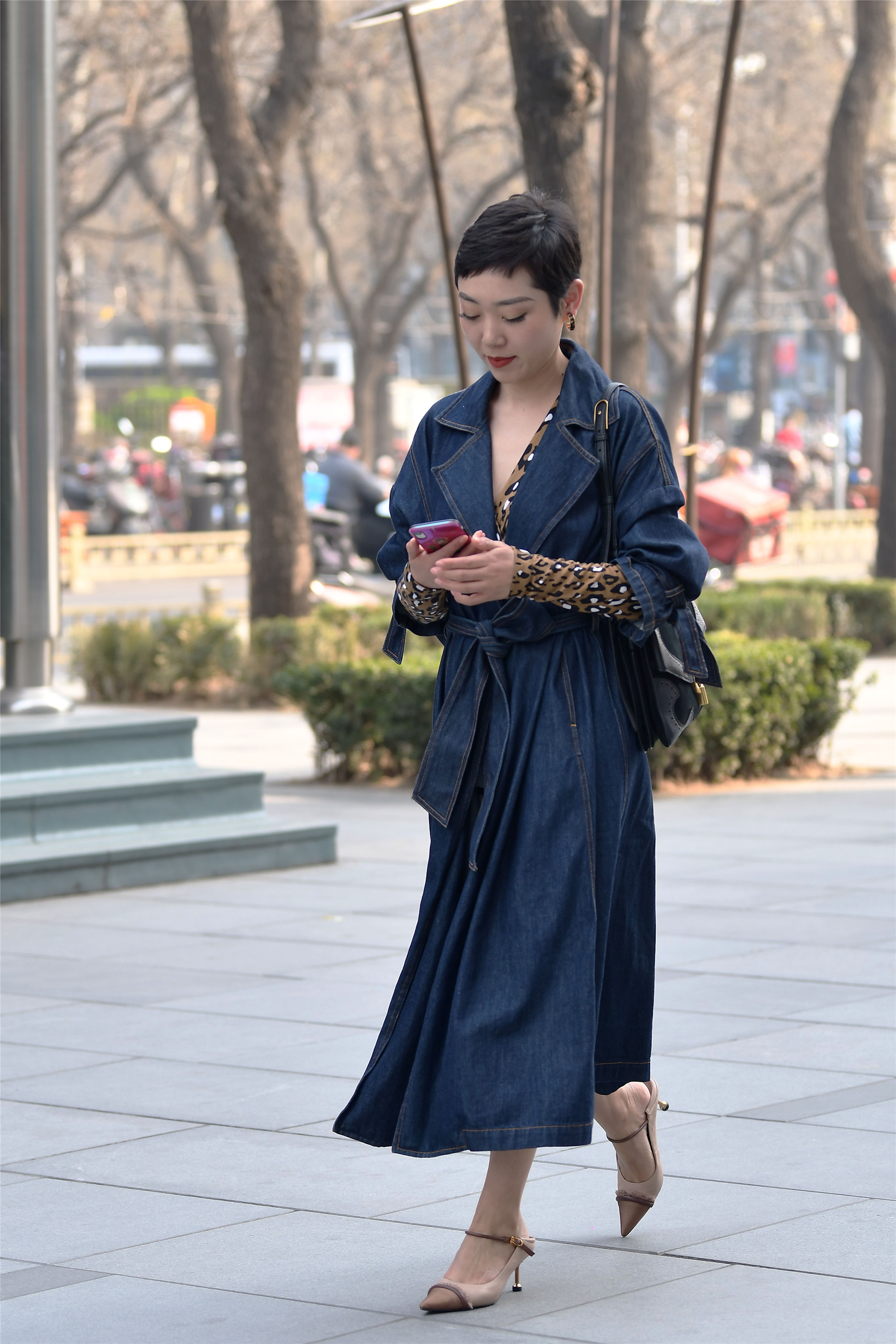 春天的风衣,也是多种多样的,每个人搭配出来的效果也是不相同的,这位姐姐一头短发,显得干净干练,深蓝色的牛仔风衣,显得人很精神,腰带系一个蝴蝶结,显得更有女人味,V领的款式,和散开的衣摆,更像是一件连衣裙的感觉,所以选择这款风衣和怎么穿,还是经过深思熟虑的,搭配一双尖头细跟鞋,当作拖鞋来穿,拼接的款式,非常有个性。
