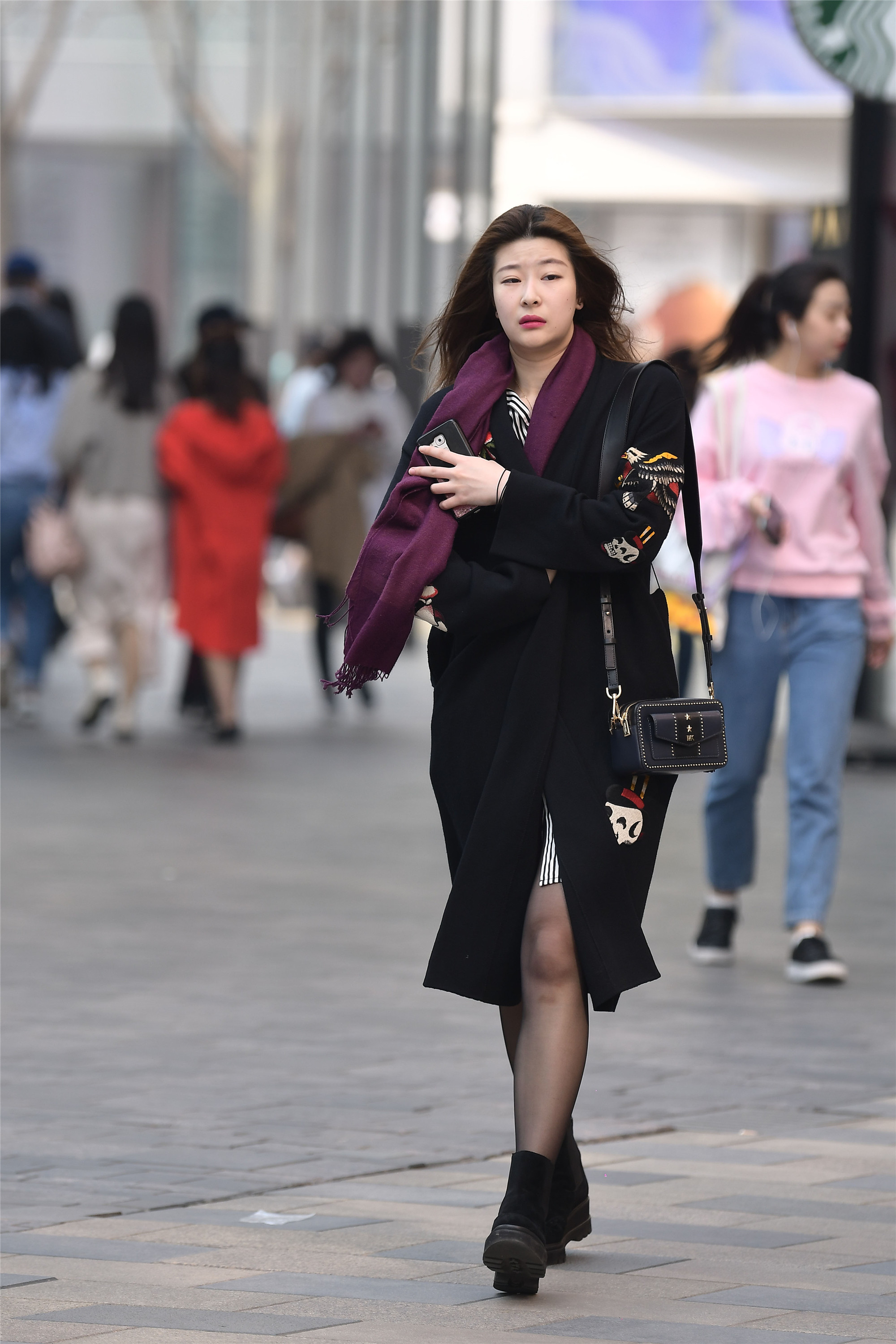 春天穿着黑色,搭配也很简单,这位姑娘一身黑色为主,黑色风衣,上面有着彩色印花,虽然不多,但是增加层次感,一条暗红色的围巾,其实更多是装饰作用,搭配黑色丝袜,让黑色有了层次感,一双黑色短靴,在春天选择黑色,要搭配出层次感,才会更加时尚。