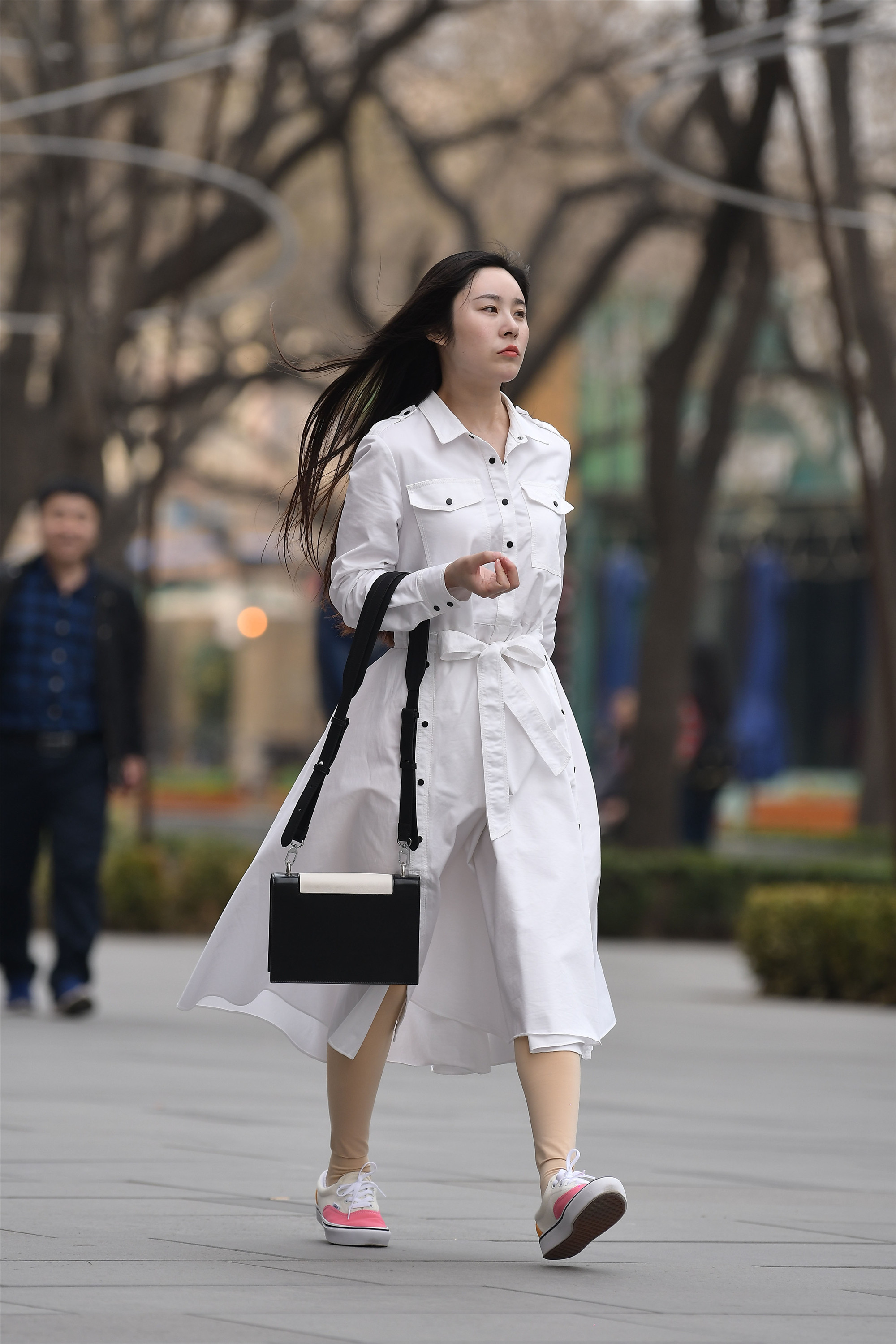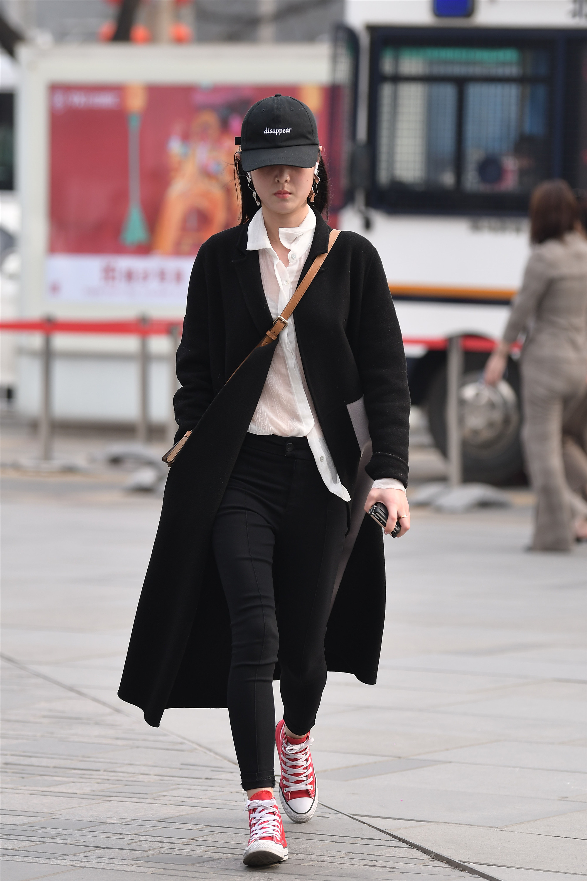 姑娘一款黑色休闲长款风衣,走路也带着一份洒脱,搭配白色半透明的衬衫,虽然没有领带什么装饰,但是显得更休闲,而且半透明的材质,也是今年很流行的元素,一侧衣襟掖在黑色修身牛仔裤里面,常见的搭配技巧,却依旧感觉很有个性,一双红色帆布平底靴,白色鞋带和白色鞋底,增加色彩变化,让黑色有了层次感。